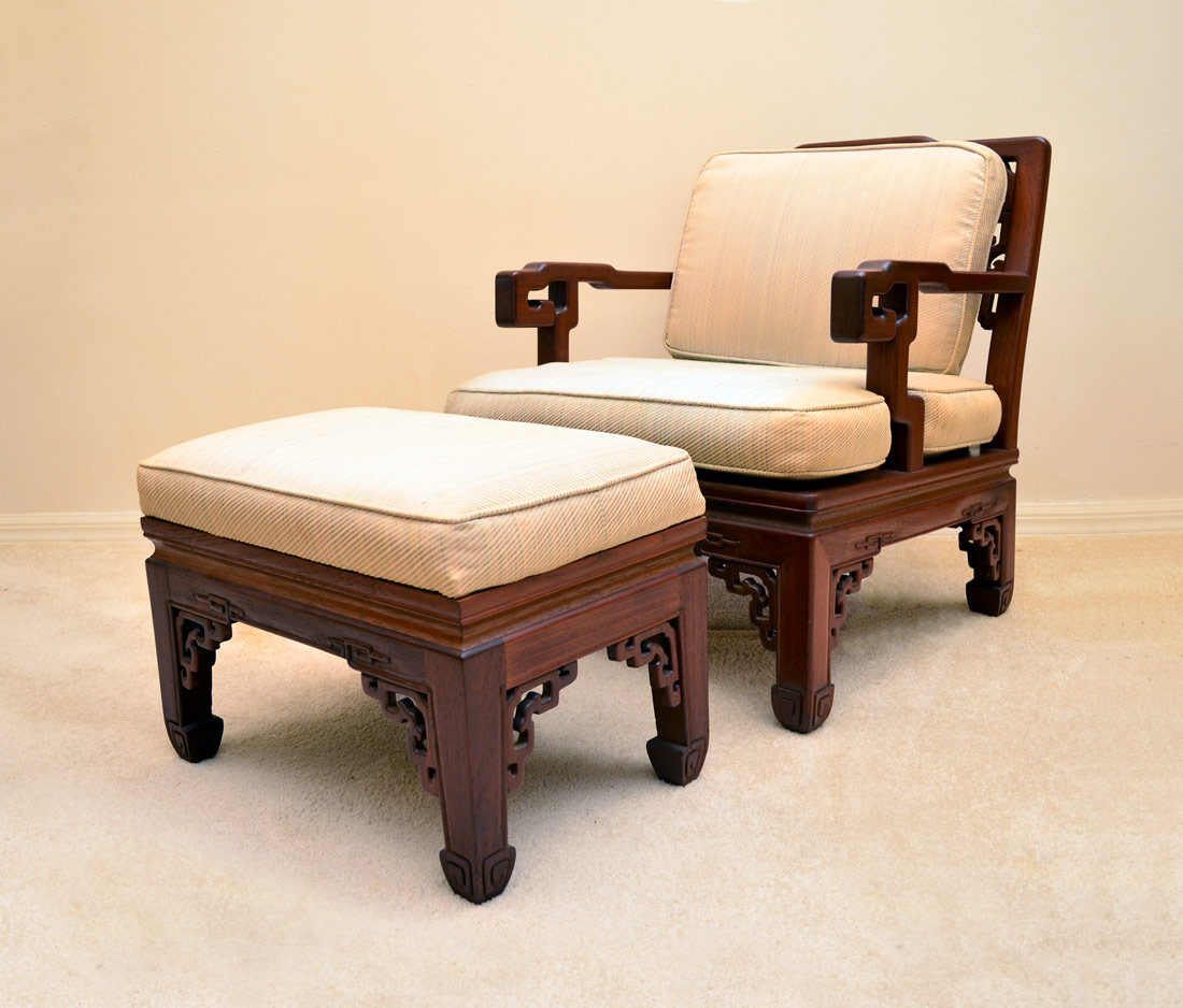 KOREAN ARM CHAIR WITH OTTOMAN: Carved and shaped frame with patterned upholstery. Chair 29 1/4'' h. x 24 1/2'' x 27 1/2'', ottoman 15'' x 22'' x 15''.