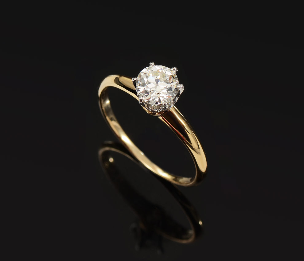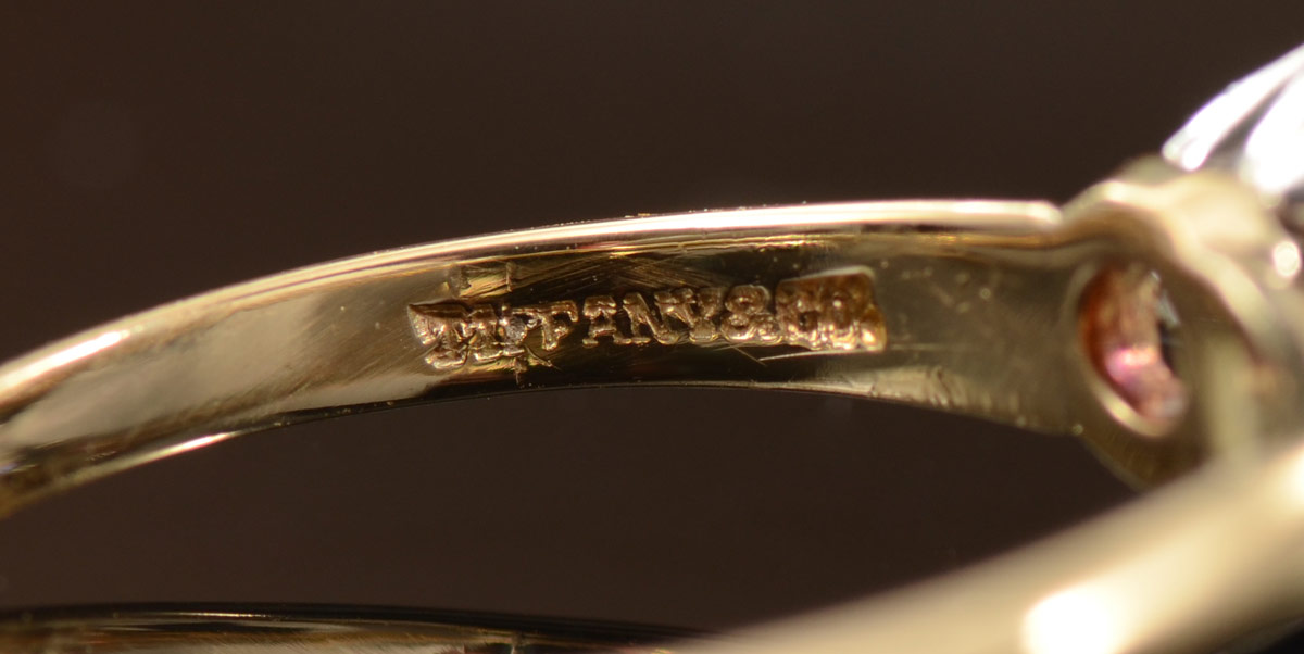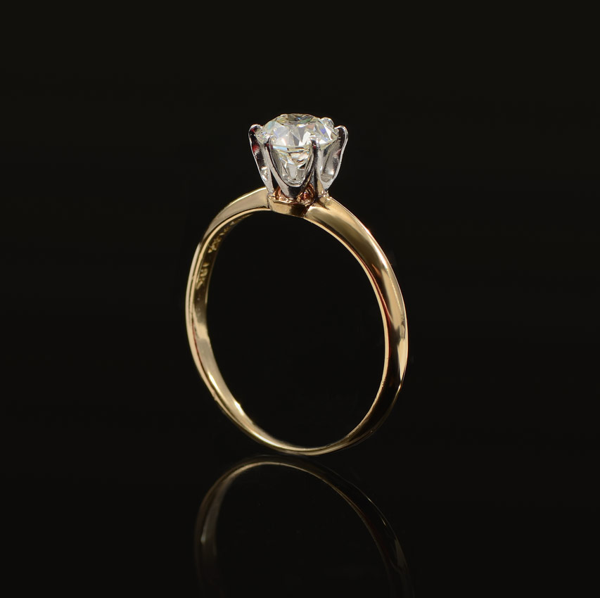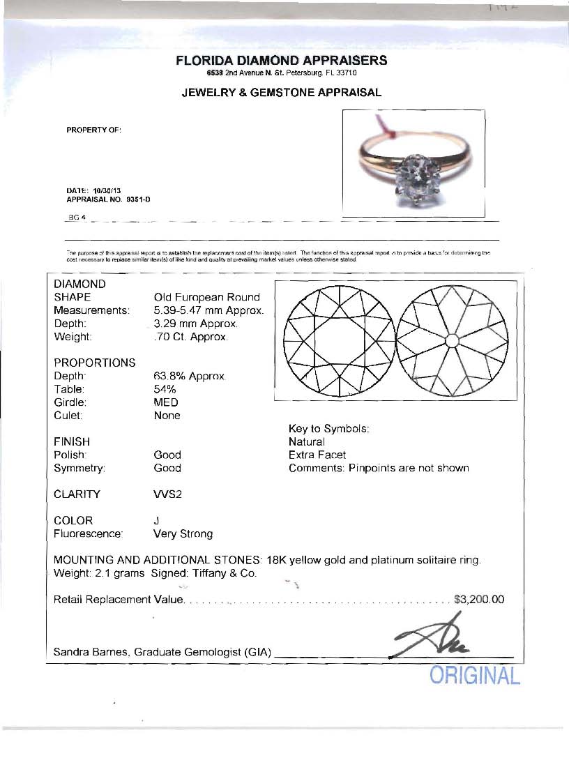 TIFFANY & CO DIAMOND SOLITAIRE RING: 18k yellow gold ring with the solitaire diamond set in platinum. The diamond is an old European round cut .70 Ct diamond of VVS2 clarity and J color. Mounting is signed Tiffany & Co. Size 6.5. Weight 2.1 grams. Sold with current Florida Diamond Appraisers GIA graduates appraisal for $3200.