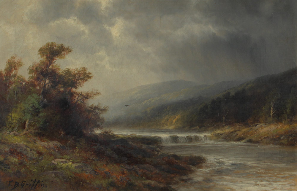 GRIFFIN, Thomas, B., (American, 1858-1918): Stormy Day on the Delaware?, an Overcast Day River Scene with Rapids, Oil/Canvas, 16'' x 24'', signed lower left, encased in period pierced carved and gilded gesso frame with wear and repair 28'' x 36'' x 4'' d.