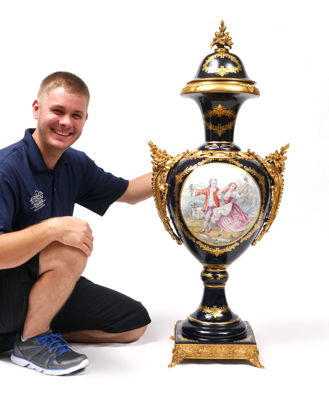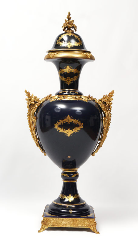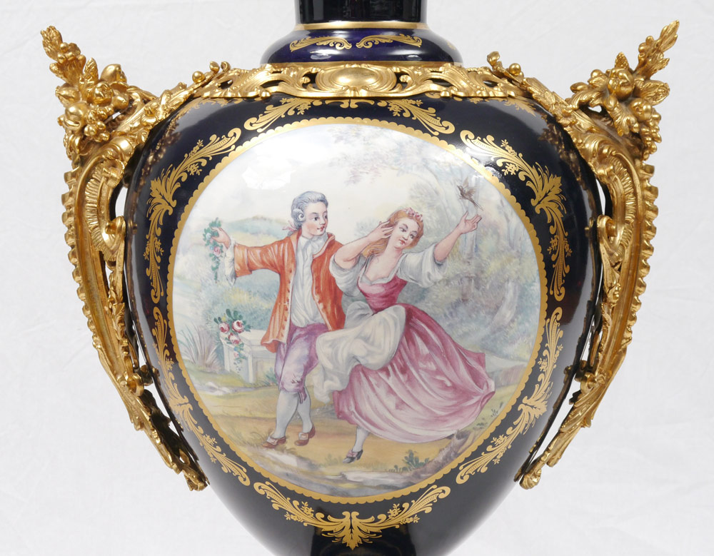 MONUMENTAL LIMOGES ORMOLU COBALT PORCELAIN COVERED URN: Central medallion with French outdoor genre scene of lovers, gilt decoration, applied gilt metal accents, on 4 feet. Signed R Limoges on urn, T. Limoges on base. Overall 46'' tall x 20''.