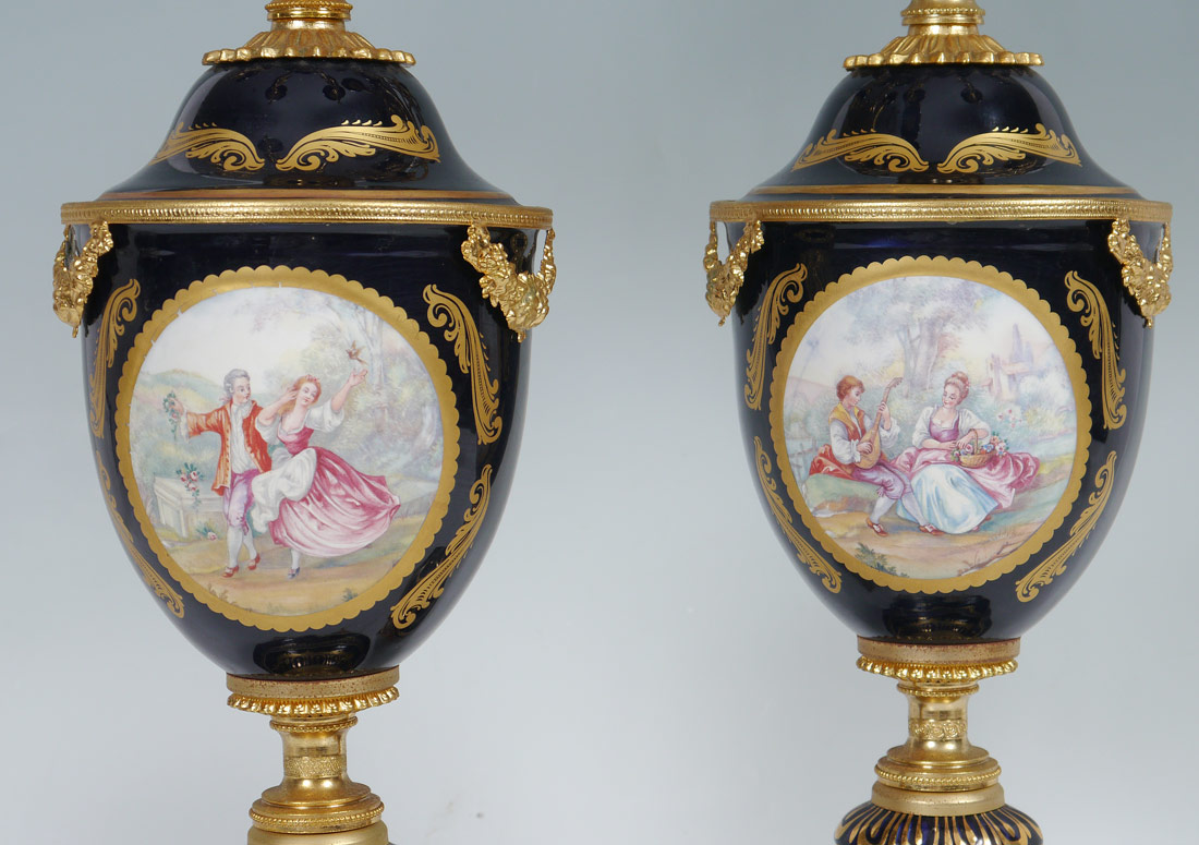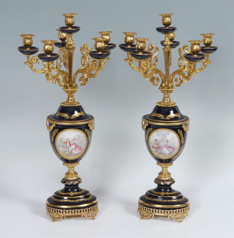 PAIR R. LIMOGES PORCELAIN CANDELABRA GARNITURE: Gilt metal and porcelain 6 light candelabra. Cobalt blue ground with medallion featuring French outdoor genre scenes, one that matches the large urn in the previous lot and gilt decoration, R. Limoges stamp to back. Each measures 34 3/4'' h. x 12''.