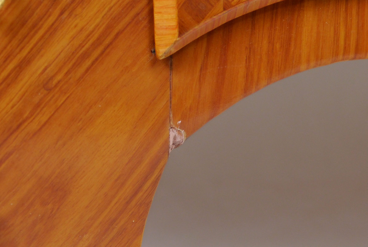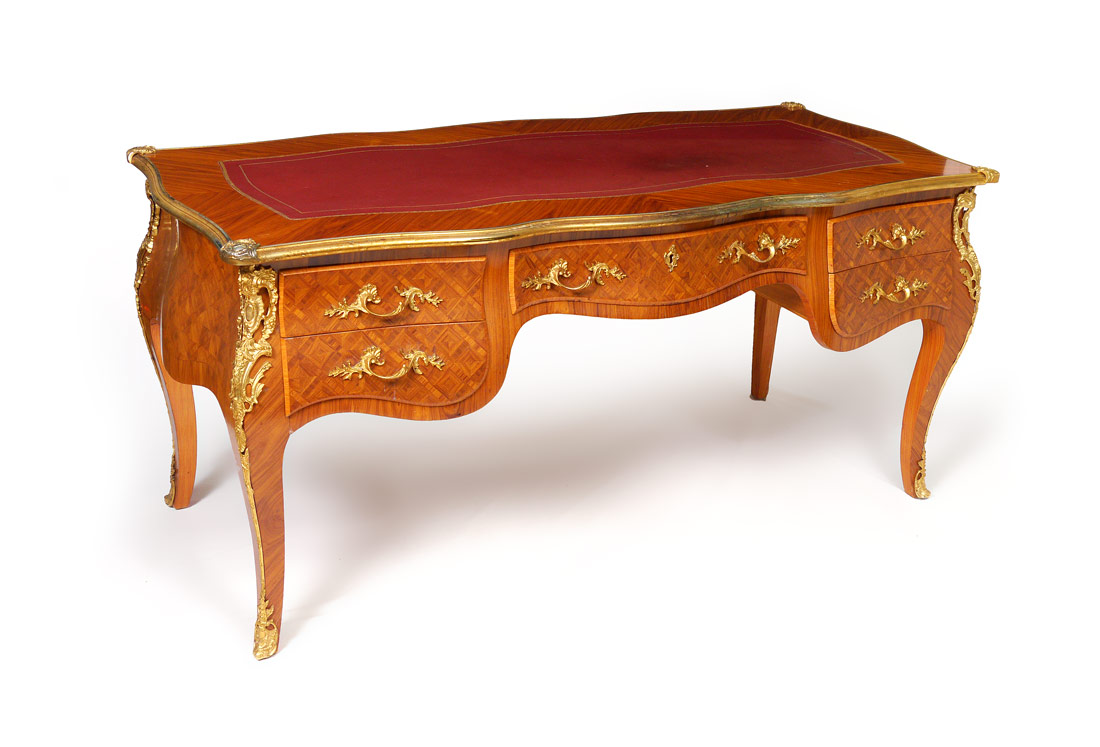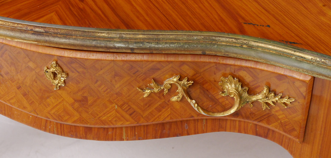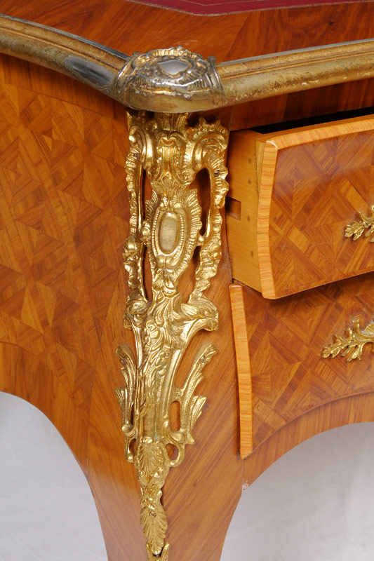 ITALIAN PARQUETRY WRITING DESK: Gold embossed red leather writing surface, shaped top. Gilt ormolu mounts, handles and hardware. 5 drawers with false drawers on opposite side. Parquetry inlaid sides and drawer fronts. 32 1/2'' h. x 68 1/2'' x 30''.