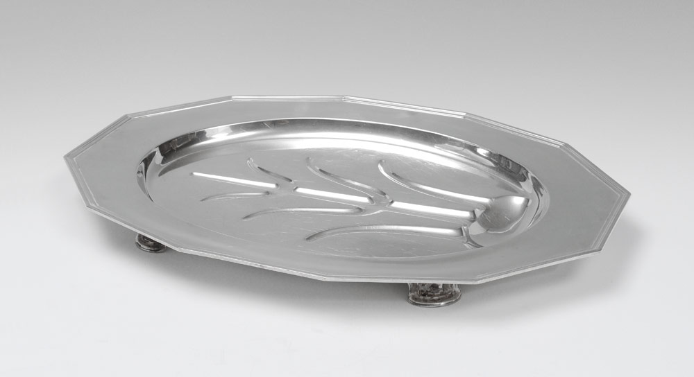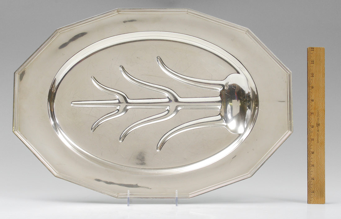 LARGE WALLACE STERLING MEAT SERVING PLATTER: 12 sided footed tray with indentions for juices, by Wallace Silversmiths, marked 2300, 22 IN. Measures 21 3/4'' x 15'', approx. 72.9 troy oz.