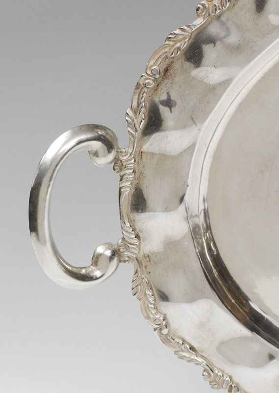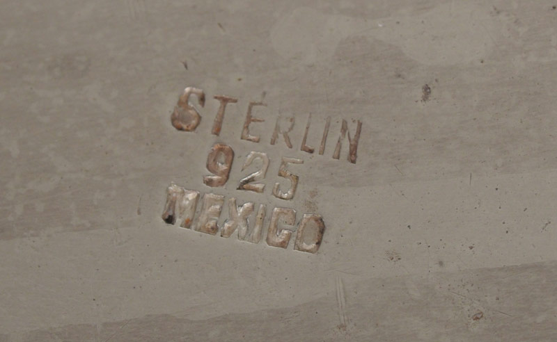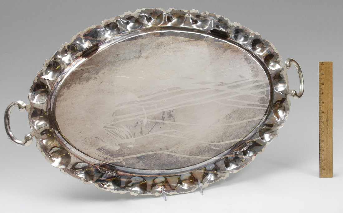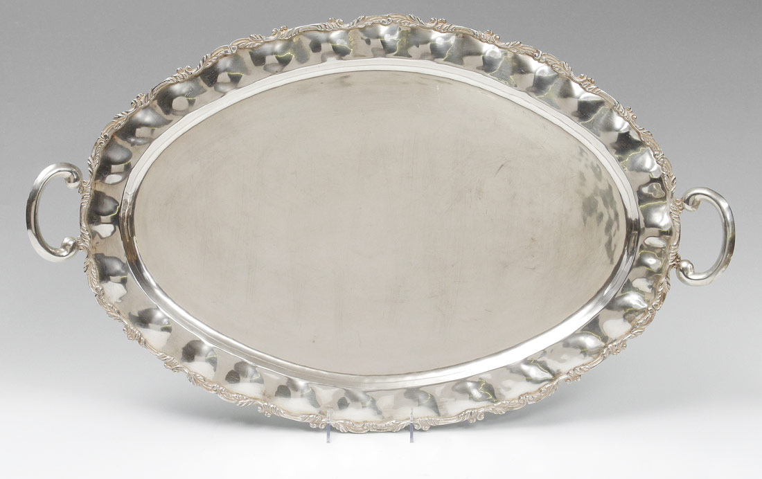 LARGE MEXICAN STERLING SILVER SERVING TRAY: Embossed hammered rim with 2 handles, on 4 feet. Marked ''Sterling, 925, Mexico'' with eagle 3 hallmark at either end. Overall measures 31'' x 18 1/2''. Approx. 102 troy oz.