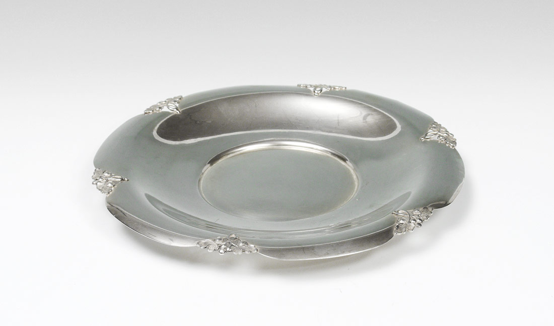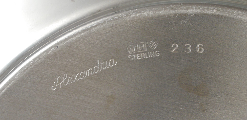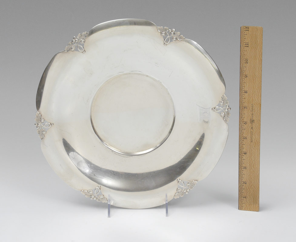 FRED HIRSCH STERLING ALEXANDRIA TRAY: Serving tray in the Alexandria pattern by M. Fred Hirsch Co.. Shaped rim with reticulated grape and leaf design. Measures 12 1/2'' dia., approx. 20.6 troy oz.