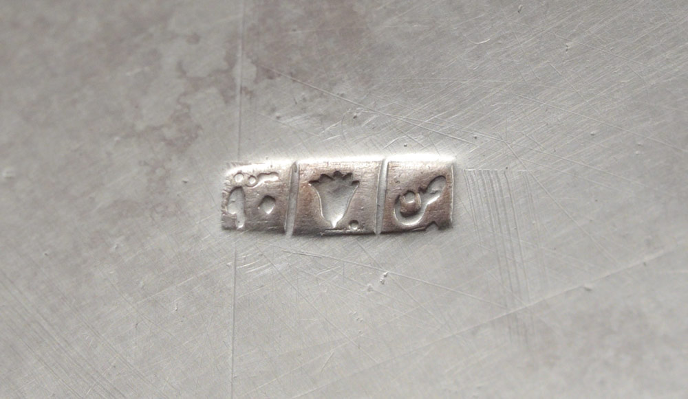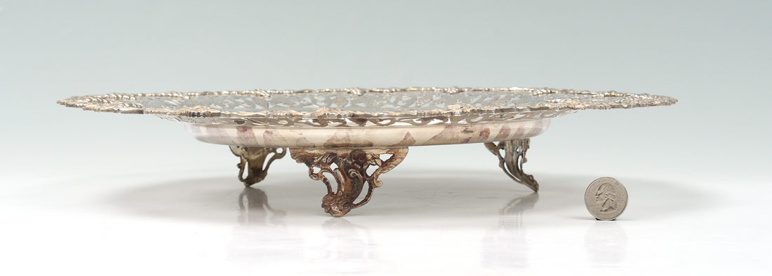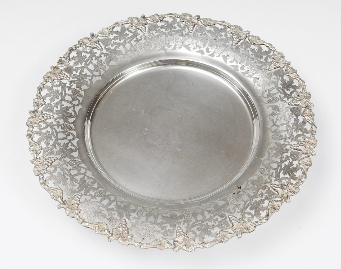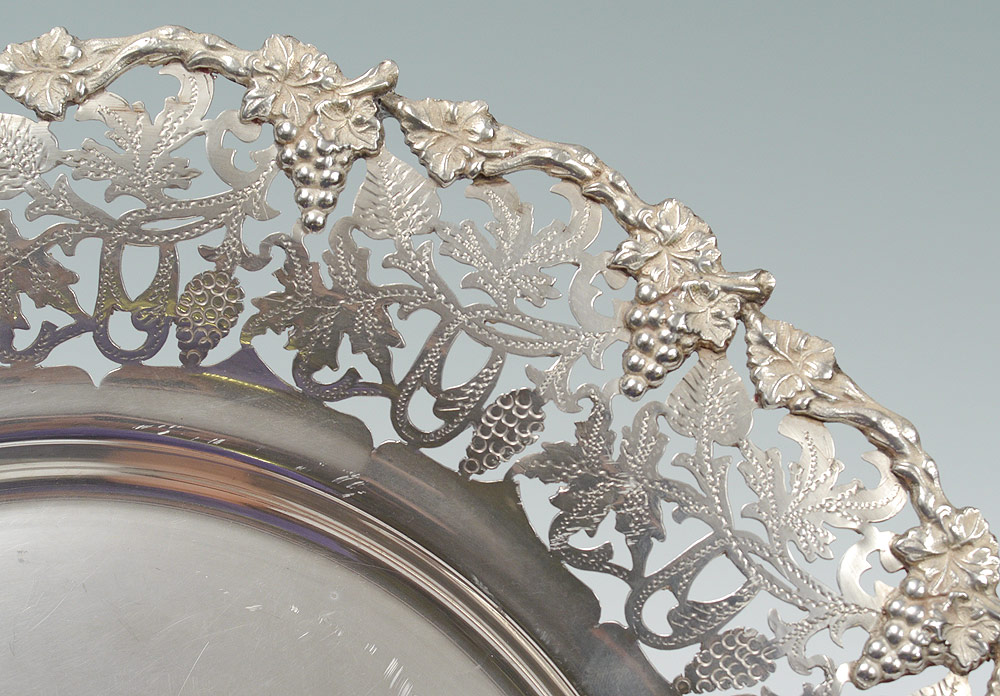 EGYPTIAN SILVER RETICULATED GRAPE VINE RIM TRAY: Footed tray with pierced grape vine motif rim, marked with Egyptian silver hallmarks on base. Approx. 32.4 troy oz.