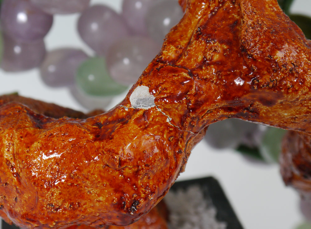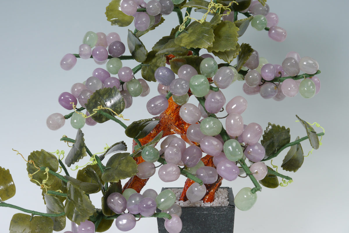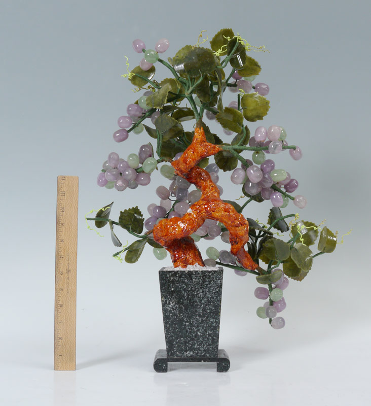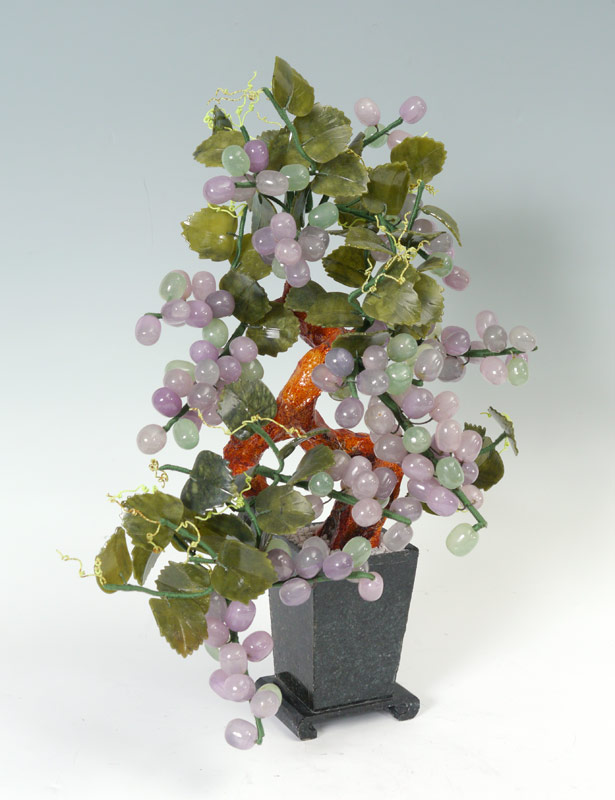 CHINESE CARVED STONE GRAPES & VINES: Quartz and serpentine full clusters of grapes on vine, in a stone pot, measures 22'' tall x 16'' wide.