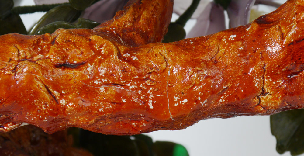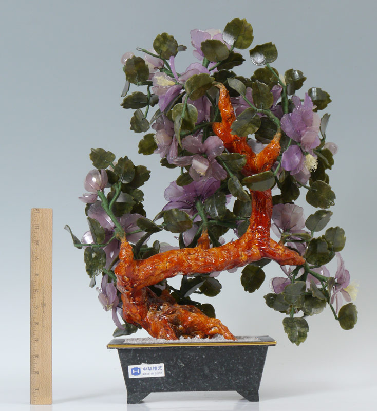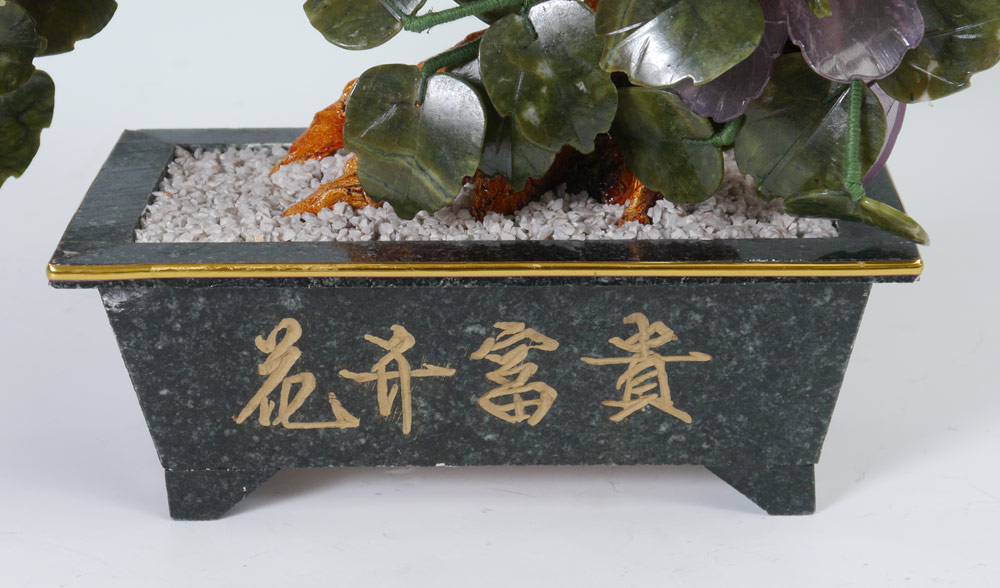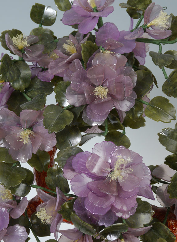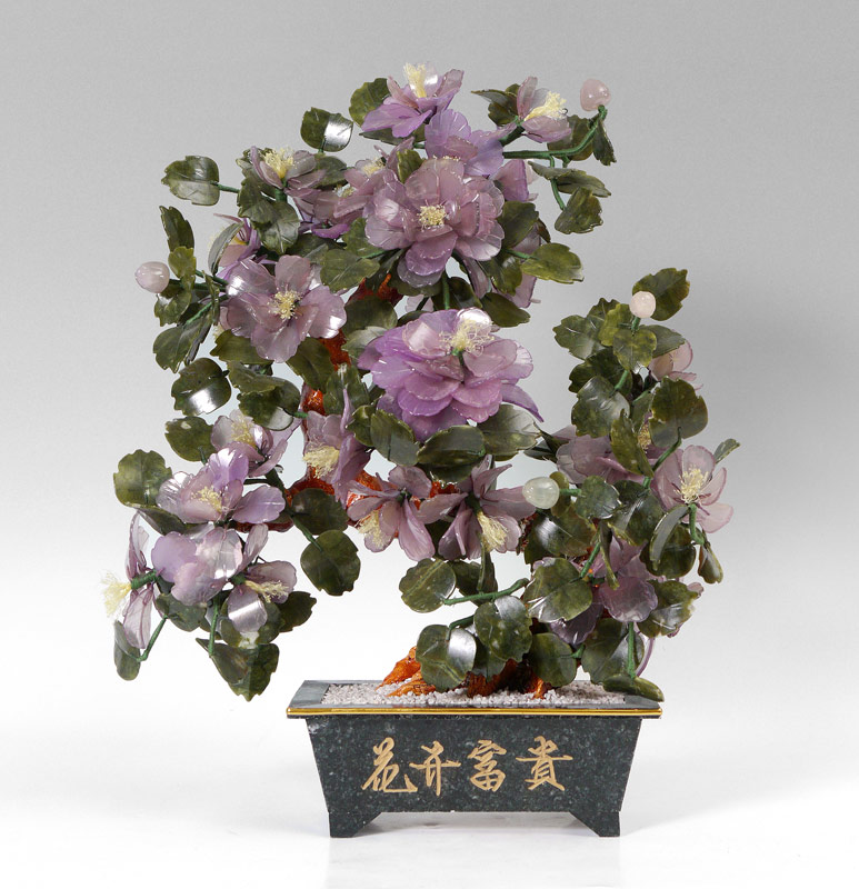 CHINESE CARVED STONE FLOWER TREE: Purple peony tree, quartz and serpentine flowers and leaves in a stone jardiniere. Measures approx. 23'' tall x 19'' wide.