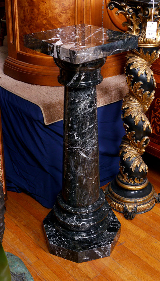 MASSIVE ITALIAN BLACK VARIAGETED MARBLE PEDESTAL: One of the best we've ever sold. 37 1/2''h, top is 14'' square!