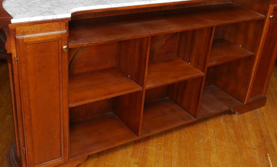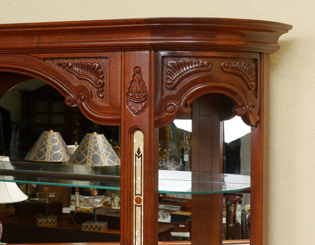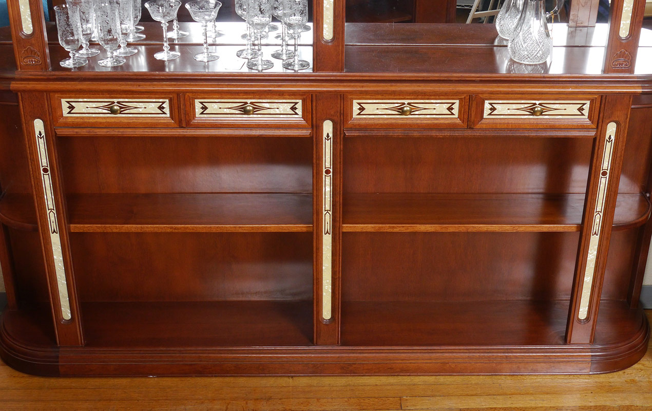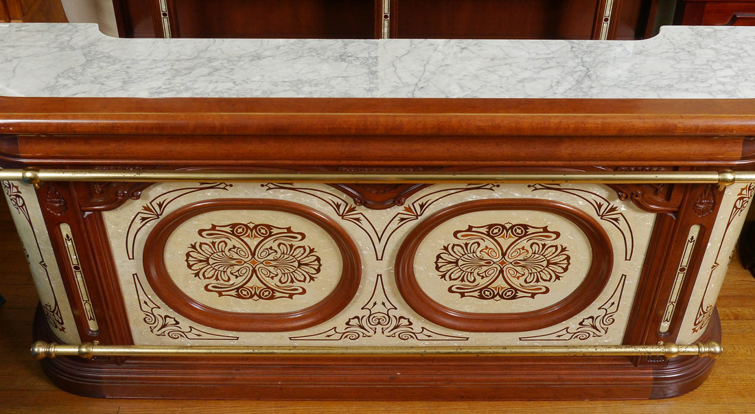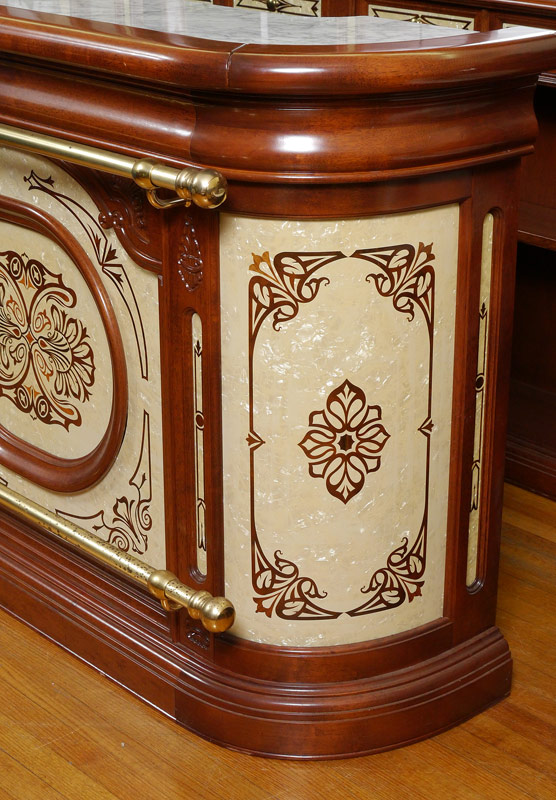 CONTEMPORARY ITALIAN BAR WITH BACK BAR: 2 pieces to include 1) Bar with marble top, front with carved decoration, panels with faux mother of pearl and wood inlay. Back side of bar with 2 doors, open shelf and 3 open storage sections. Measures 43 1/2'' h. x 94 1/2'' x 20 1/2''. 2) Back bar, illuminated top section with mirrored back and 4 glass shelves. Base with 4 drawers over single shelf open storage. Matching carved decoration and faux mother of pearl and inlay. 85 1/4'' h. x 89'' x 11 1/2''.