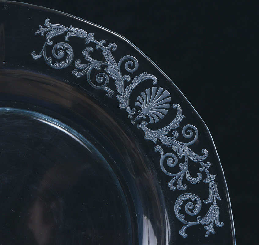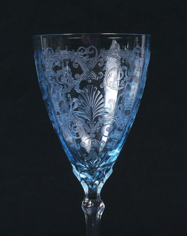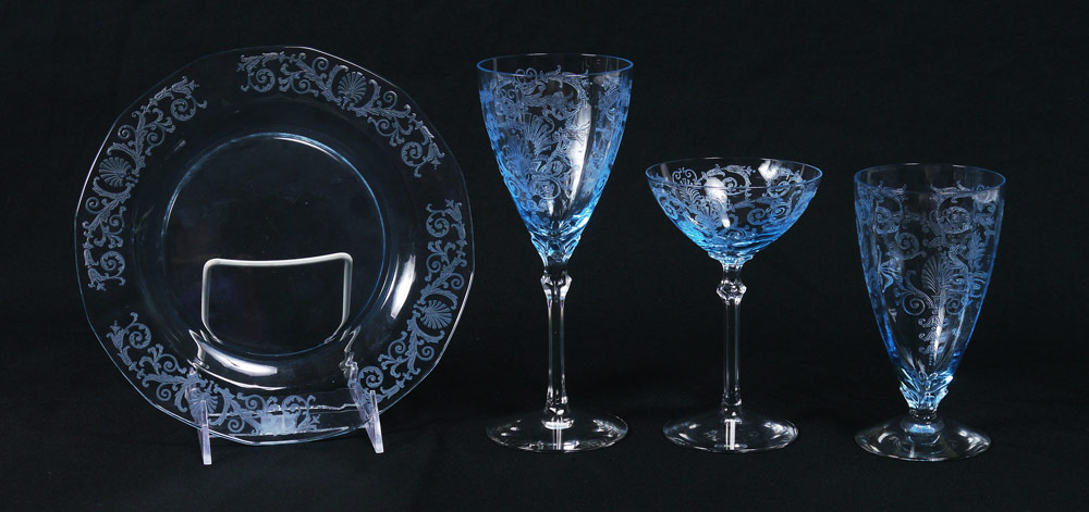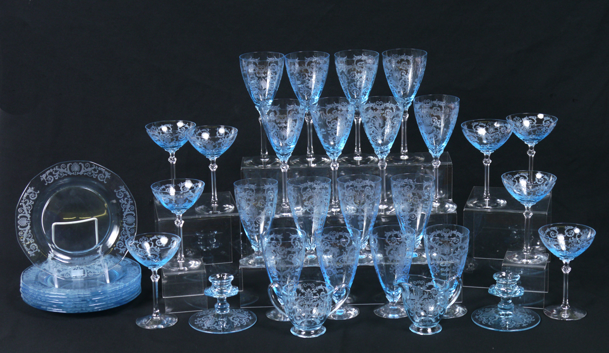 FOSTORIA VERSAILLE ELEGANT BLUE GLASSWARE: Approx. 28 pieces to include 8 plates (9'' dia), 8 wine glasses (8 1/4'' h.), 8 water (6''), 8 martini (6''), open creamer, open sugar, 2 candlesticks.