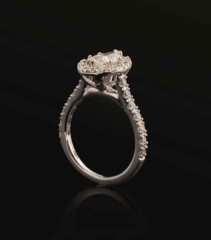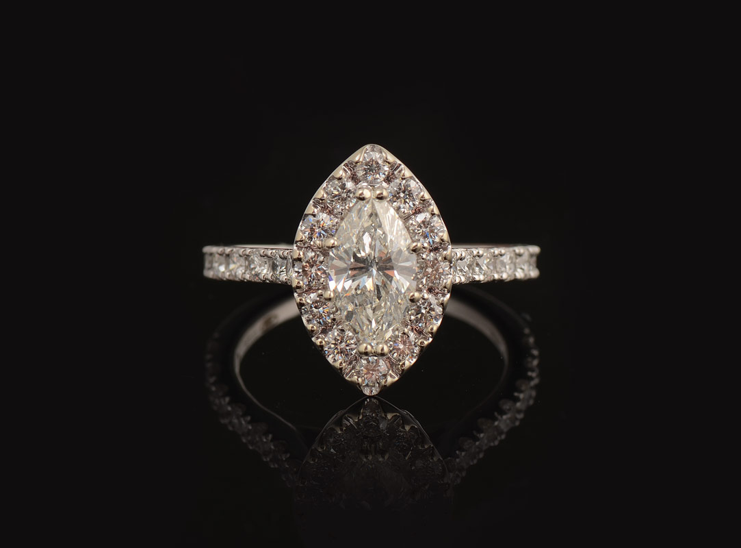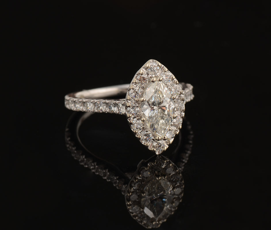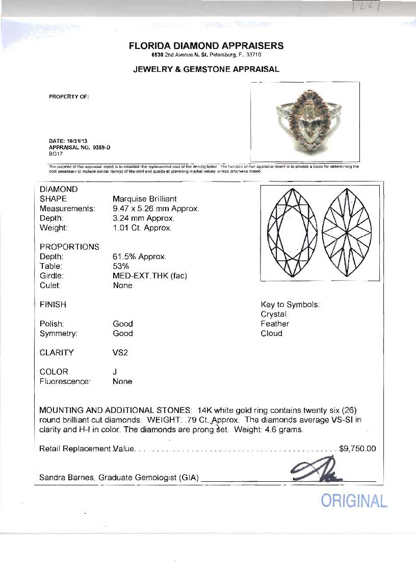 MARQUISE DIAMOND RING: 14K white gold ring centers an approx. 1.01 Ct marquise brilliant cut diamond of VS2 clarity and J color. The mounting has an additional 26 diamonds totaling approx. .79 Ct. Size 6.25. Weight 4.6 grams. Sold with current Florida Diamond Appraisers GIA graduates appraisal for $9750.