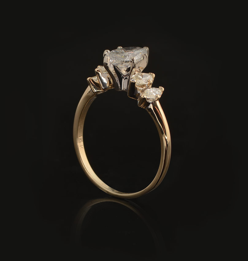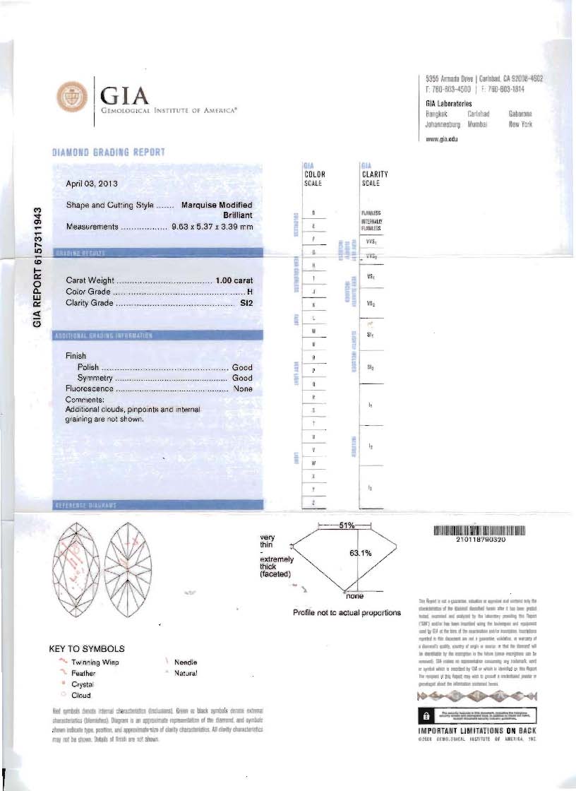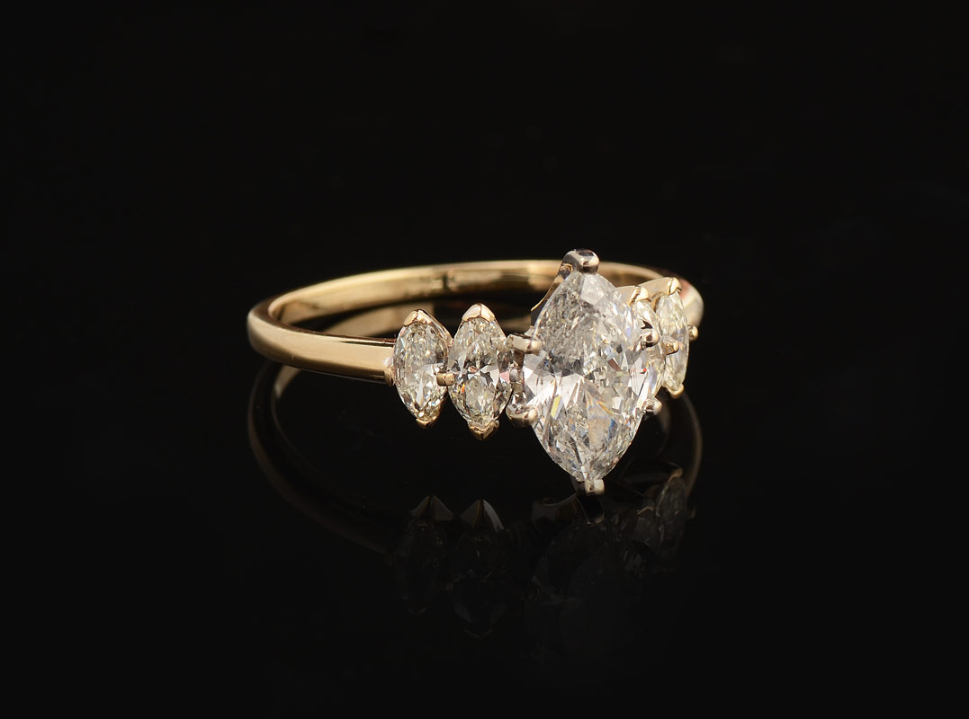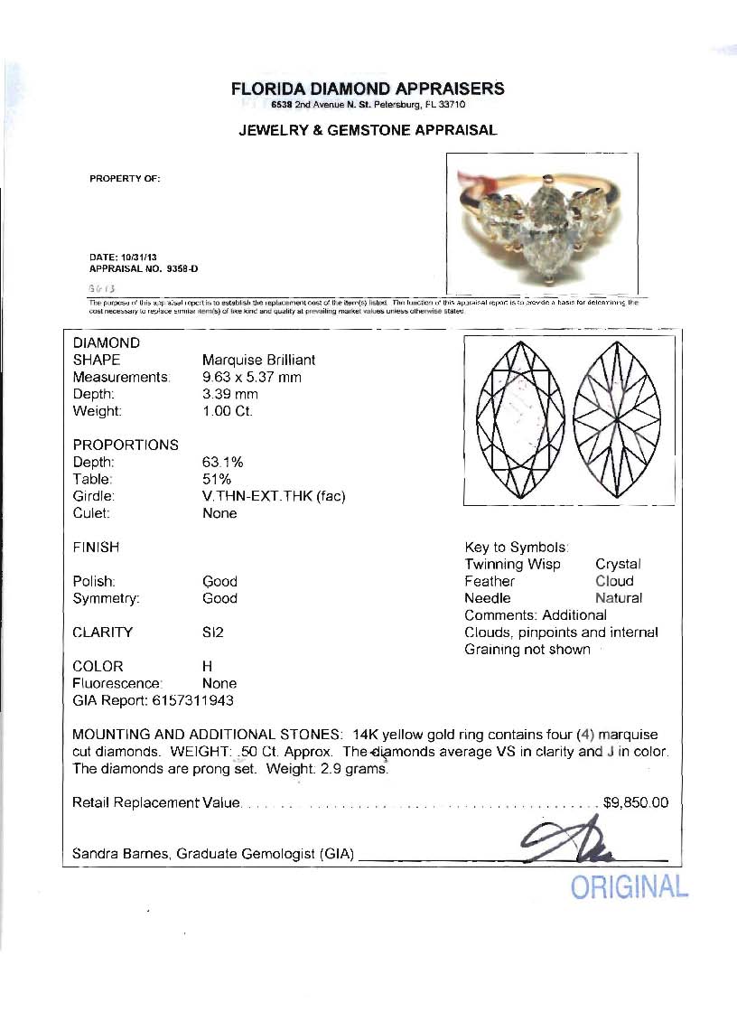 5 STONE MARQUISE DIAMOND RING WITH GIA REPORT: 14K yellow gold ring centers a 1.0 Ct. marquise brilliant cut diamond of SI2 clarity and H color. GIA report #6157311943. The side marquise diamonds total approx. .50 Ct. Size 7 1/2. Weight 2.9 grams. Sold with current Florida Diamond Appraisers GIA graduates appraisal for $9850.