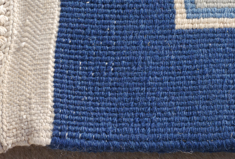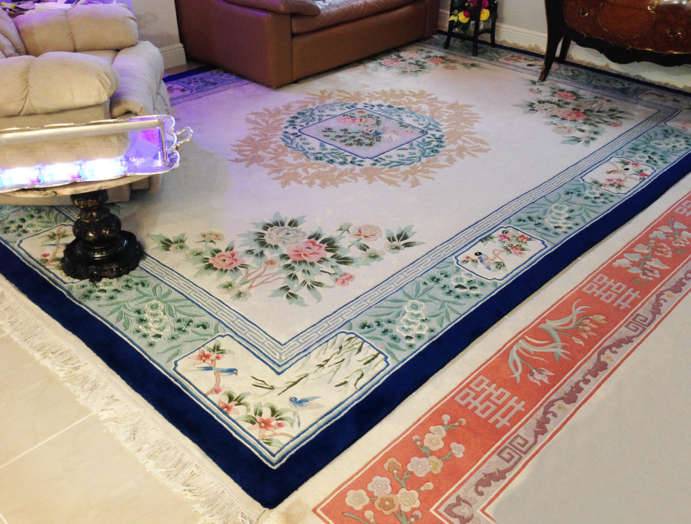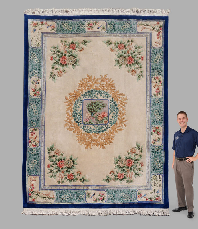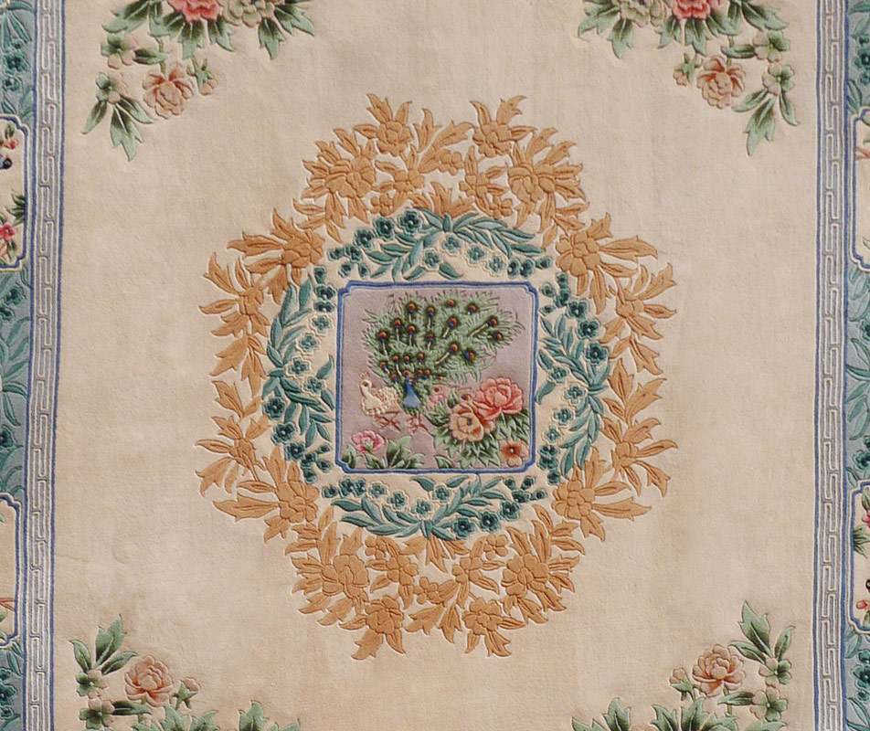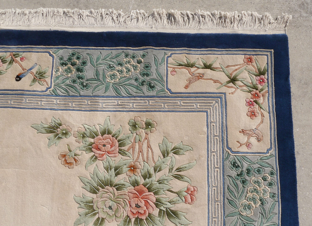 CHINESE AUBUSSON CARPET, 9' x 12': This carpet is an interesting mixture of an Aubusson design combined with an Art Deco Chinese design. There is a central medallion that has a squared central panel with peacocks and flowers surrounded by sprays of turquoise blue flowers and peach colored flowers on an ivory field. The border of bluish green with sprays of flowers has white panels and matching corners with birds on flowering bamboo. There is a deep blue edge to the entire rug. The four corners of the rug have realistically drawn flowers that look like they are growing out of the ground. Condition is excellent.