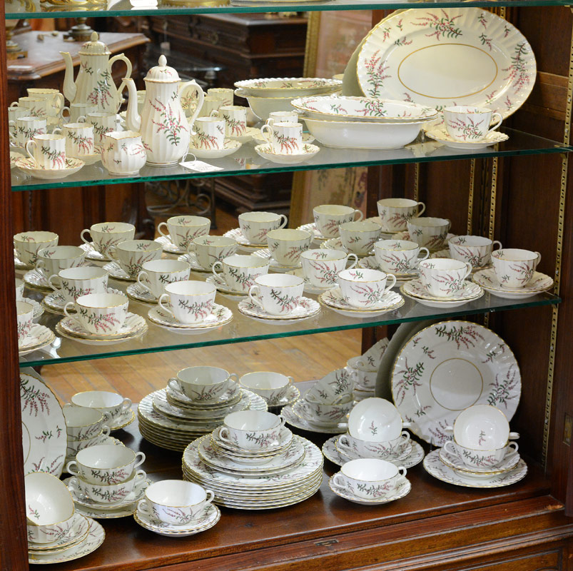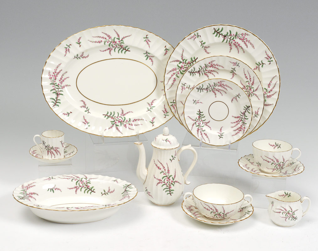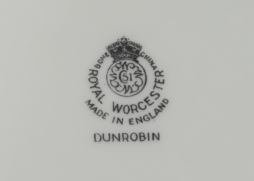 ROYAL WORCESTER DUNROBIN FINE CHINA: Approx. 107 pieces in the Dunrobin pattern by Royal Worcester to include 10 dinner plates (10 1/2''), 6 salad, 10 bread, 11 cream soups, 12 underplates, 15 teacups, 16 saucers, platter (13 3/4'' x 9 1/4''), 2 open vegetable bowls, open creamer, coffee or teapot 7 1/2'', 11 demitasse cups, and 11 saucers.