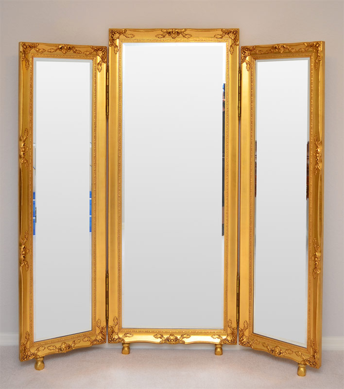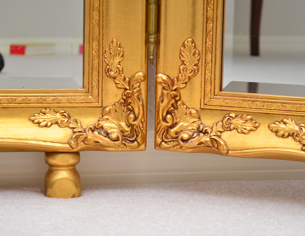 3 PANEL GOLD GILT FLOOR DRESSING MIRROR: Carved gilt wood frame, center panel 72 1/4'' h. x 29 1/2'' , side panels 68 1/2'' h. x 19 1/2''.