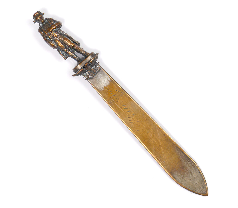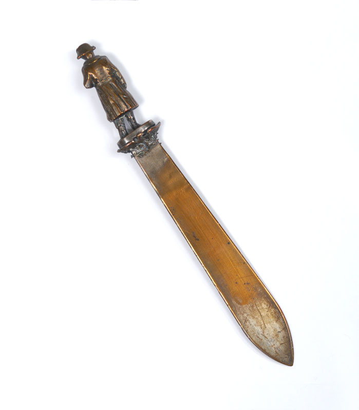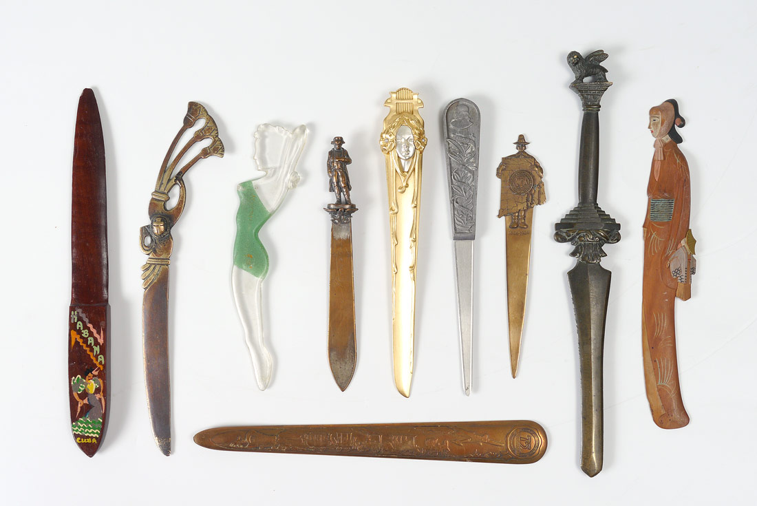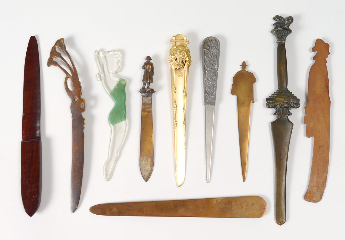 10 PIECE COLLECTION OF LETTER OPENERS: An assembled collection to include bronze, wood, mixed metal and plastic. Longest measures 10 7/8''.