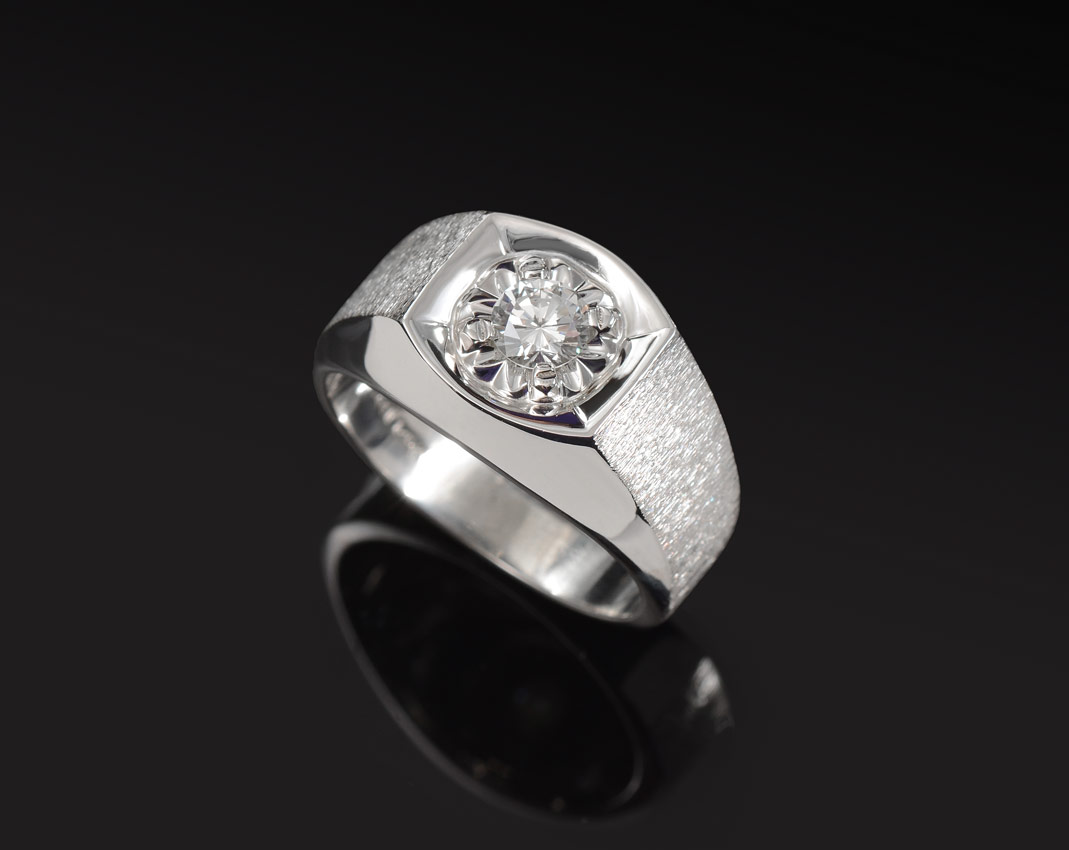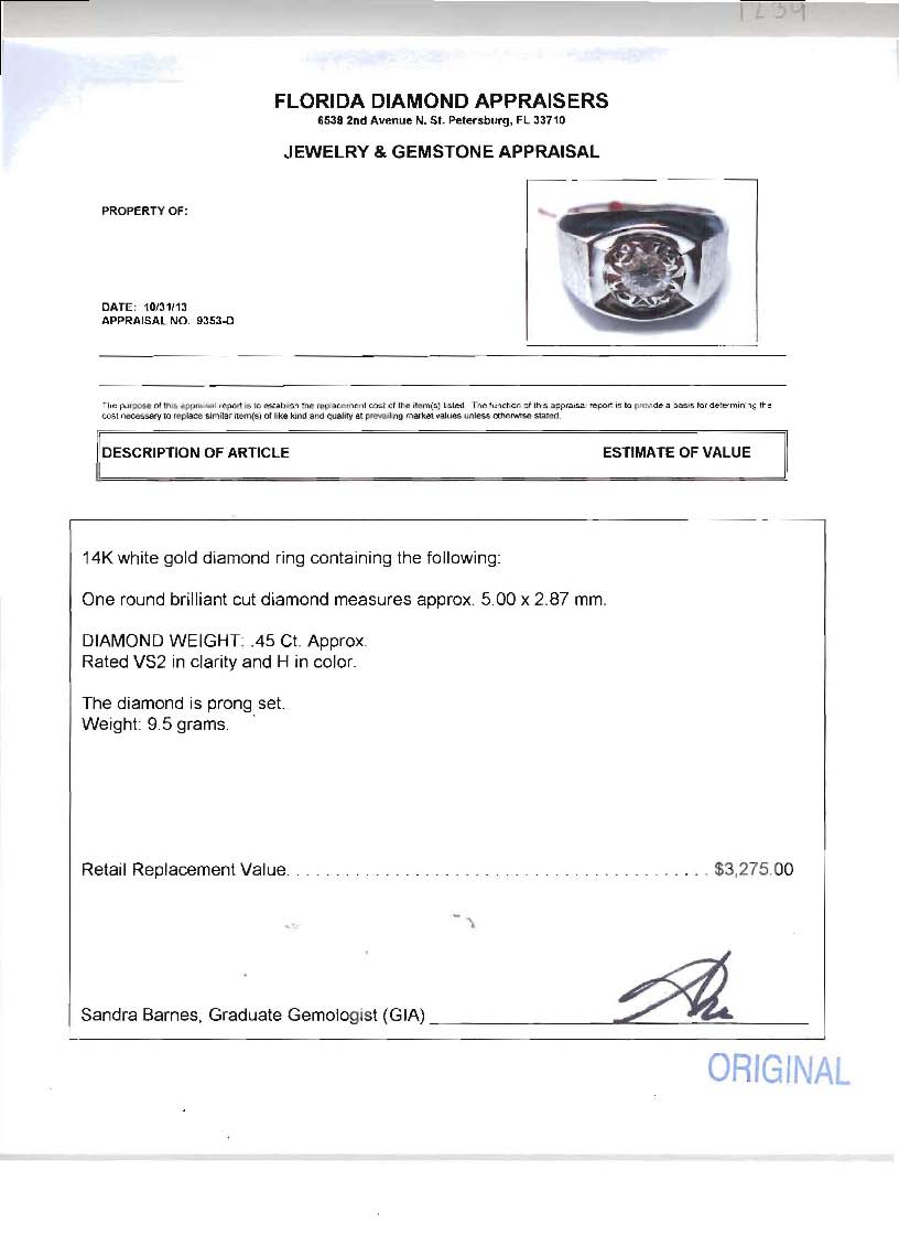 14K GOLD GENT'S DIAMOND SOLITAIRE RING: Centering a round brilliant, approx. .45 Ct diamond of VS2 clarity and H color. Size 9.5, Weight 9.5 grams. Sold with current Florida Diamond Appraisers GIA graduates appraisal for $3275.