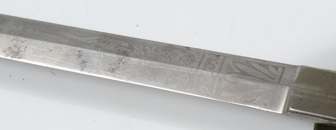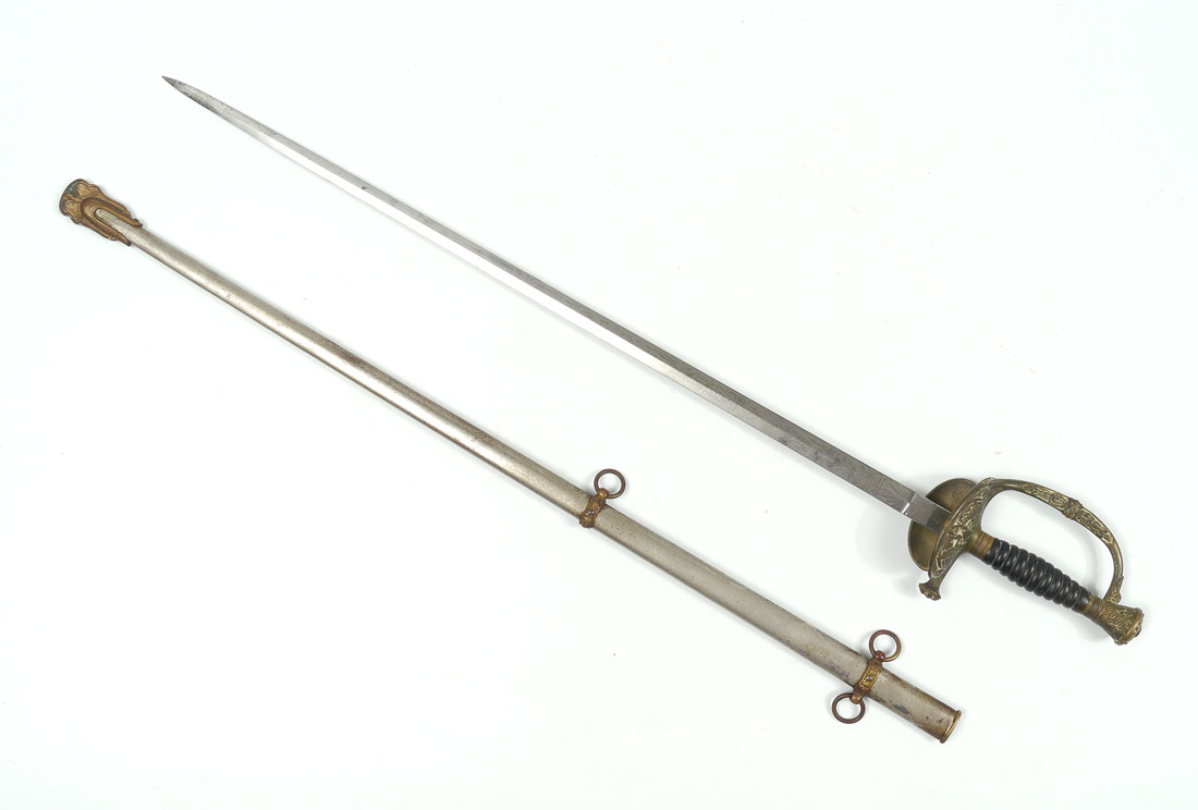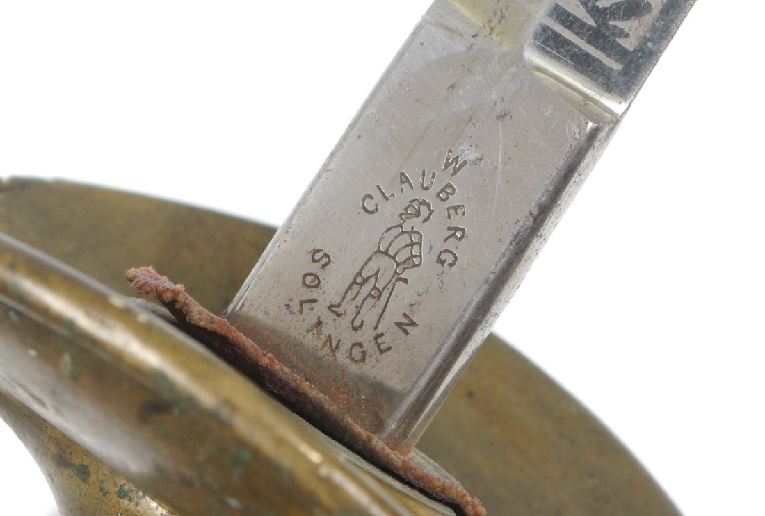 IMPORT MODEL 1860 OFFICERS SWORD: Cast brass hilt with wood grip, folding counter guard. 25 3/4'' W. Clauberg, Solingen import blade with frosted stand of arms and foilate motifs. Metal scabbard with brass mounts. Overall 35'' long.