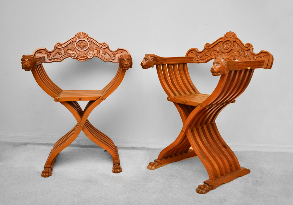 PAIR LION HEAD SAVONAROLA FOLDING CHAIRS: Carved removable back, arms ending in figural lion heads, feet ending in paws. 24 1/4'' h. x 26'' x 20 1/2''.