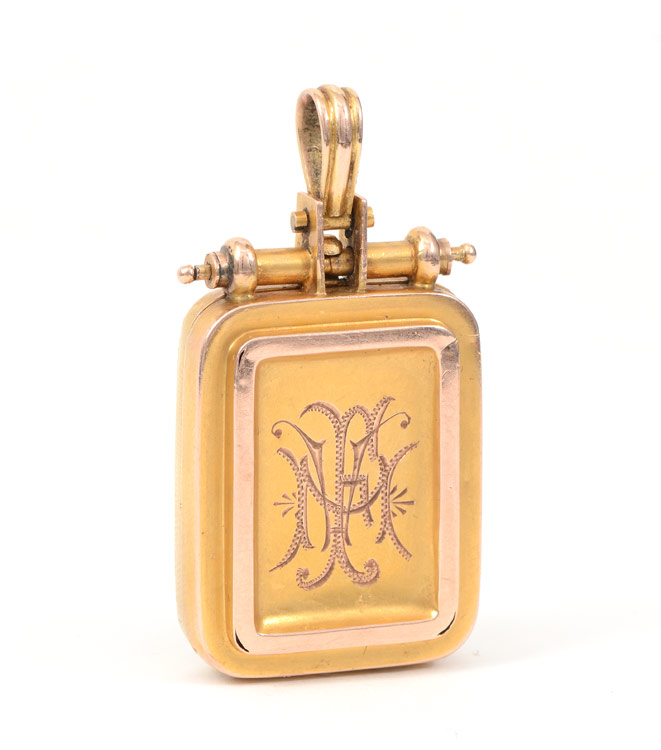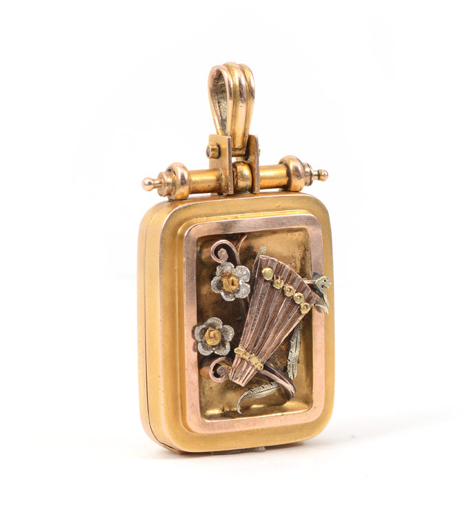 14K VICTORIAN LOCKET: 14K yellow and rose gold Victorian locket with fan and flower applique on front and monogram on reverse. Inside contains two glass frames and photograph. Weight: 16.2 grams. Locket measures 2 1/4'' x 1'', excluding the articulating bail. .