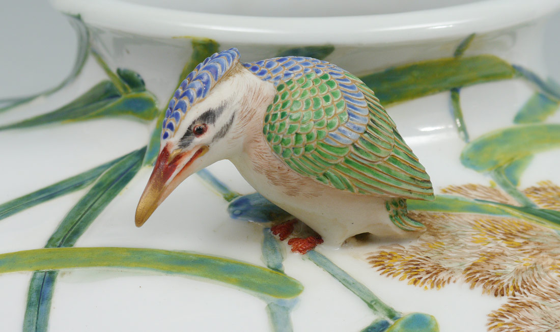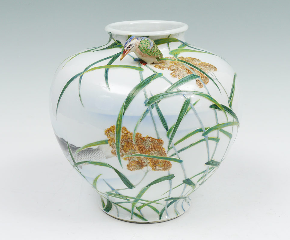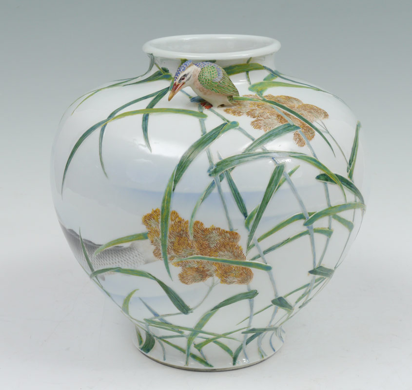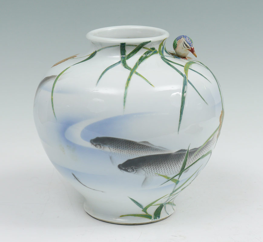 LARGE FUKAGAWA JAPANESE PORCELAIN VASE: With painted Koi fish or carp decoration under applied bamboo, flowers. Applied full body kingfisher bird at shoulder. Marked with Fukagawa marks on base. Overall measures 10 3/4'' h. x 11 1/2''