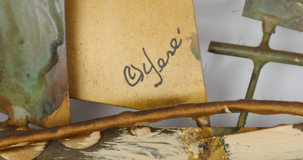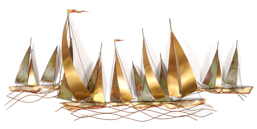 CURTIS JERE SAILBOAT REGATTA PAINTED METAL WALL PLAQUE: Approximately 28'' h. x 61'' w. , signed.