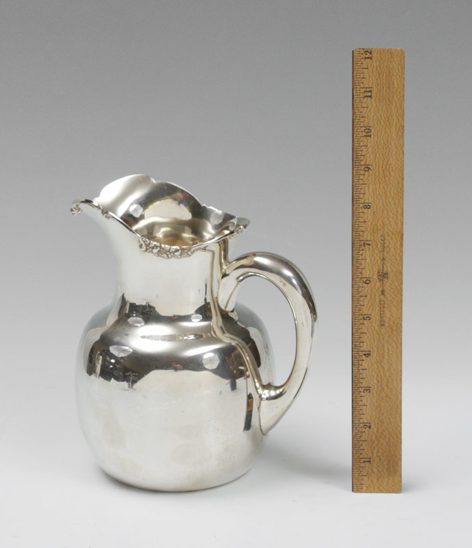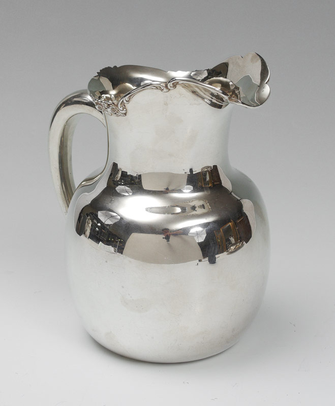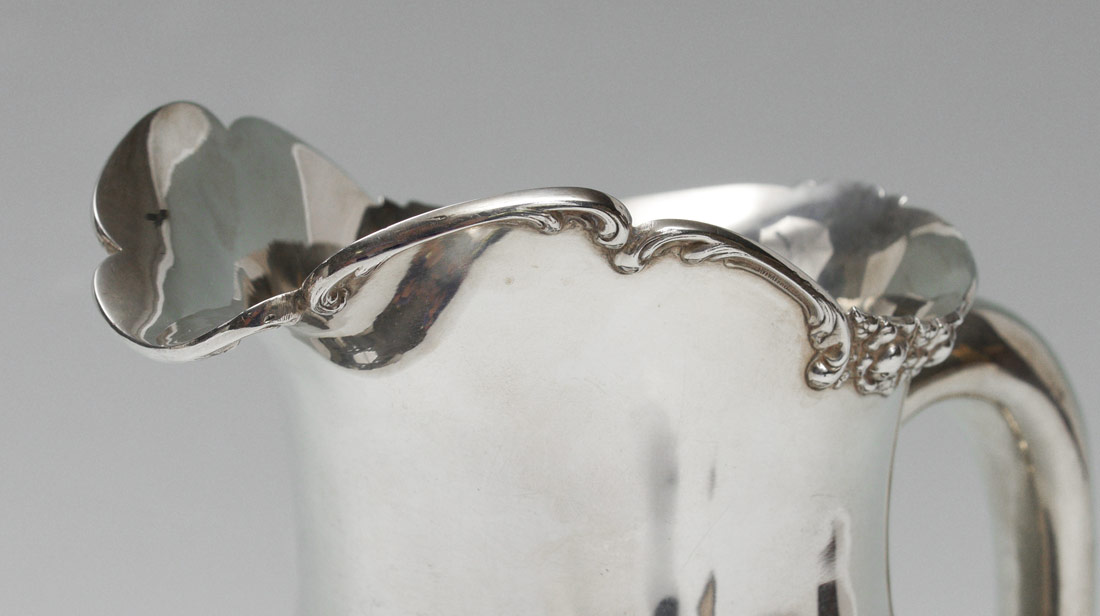 GEORGE SHIEBLER STERLING WATER PITCHER: Embossed rose and foliate scroll rim, marked with Shiebler hallmark, Sterling, 231, Thalheimer& Frank. 8'' h. x 7'', approx. 18.2 troy oz.