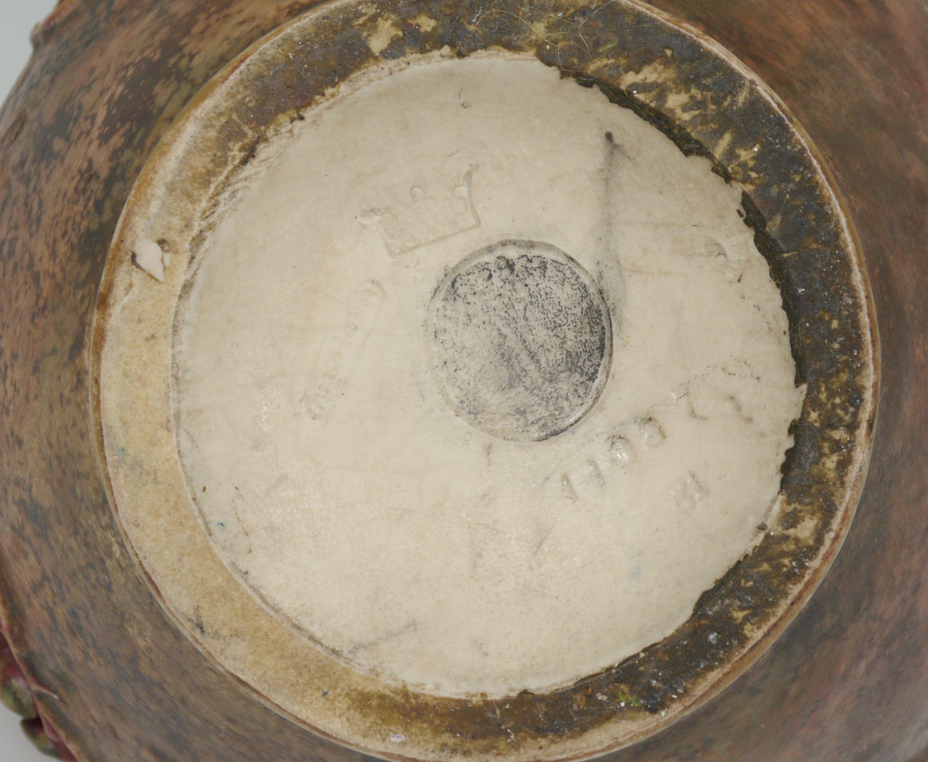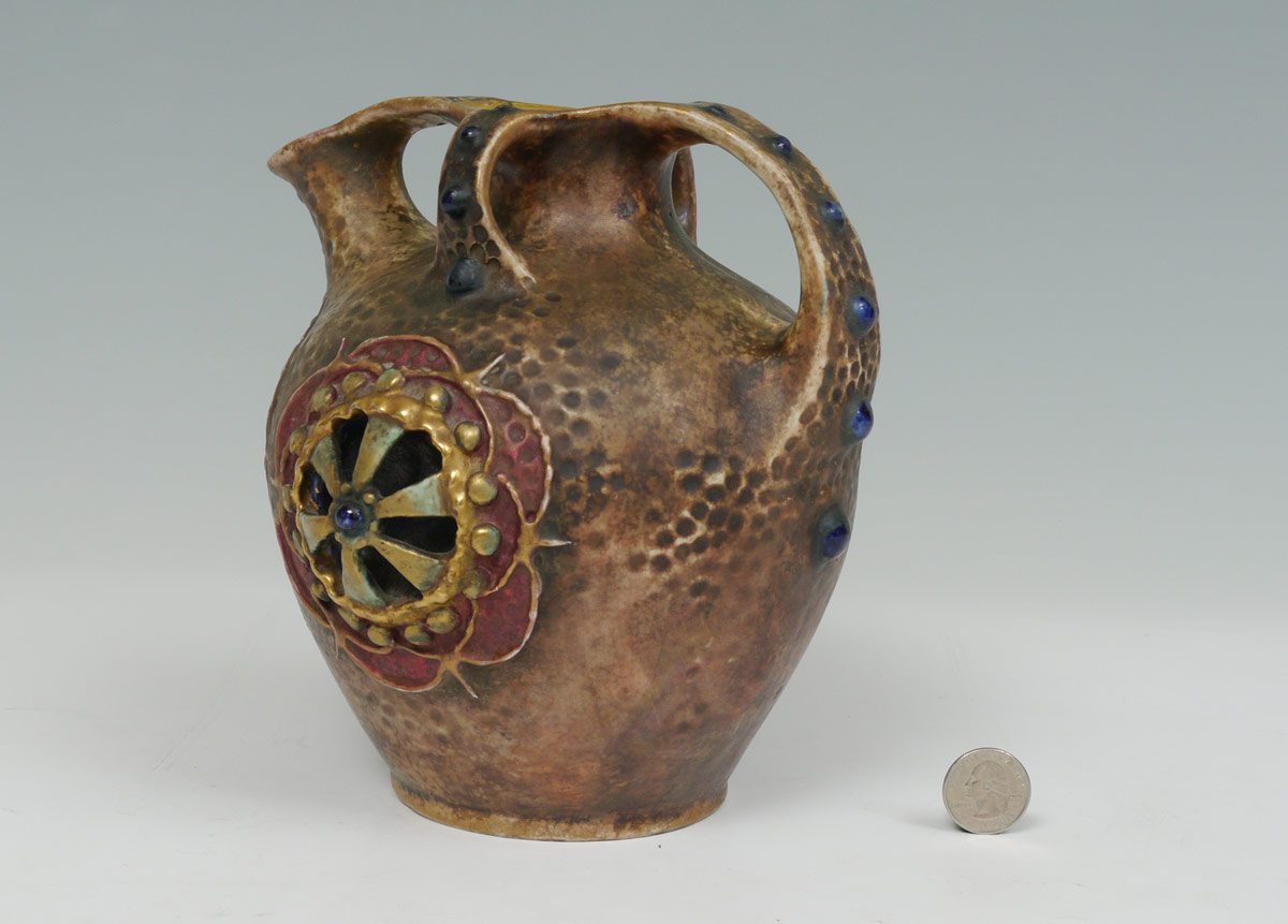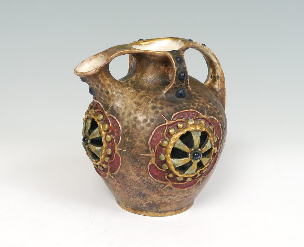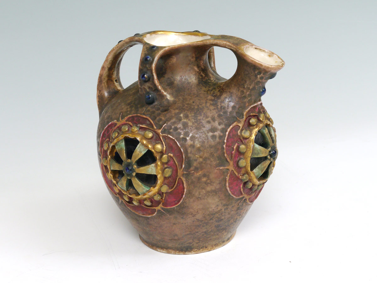 RIESSNER, STELLMACHER & KESSEL AMPHORA POTTERY EWER: Ewer or pitcher with open work florets and applied decoration. Marked on base with impressed crown and amphora mark. Overall 7 3/4'' h. x 7 3/4''.