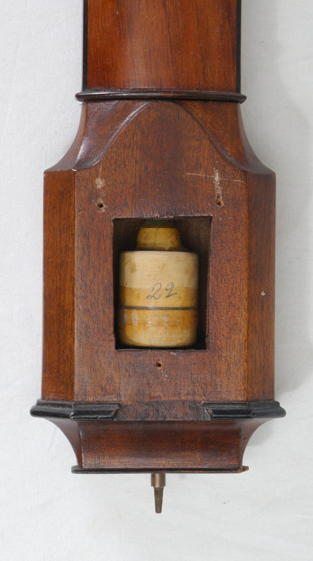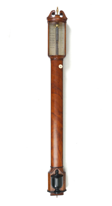 SAUNDERS & COOK STICK BAROMETER: Mahogany case, broken arch pediment with brass urn finial. Brass face marked Saunders & Cooke, Portsmouth, New Hampshire. Bone adjustment knob. Overall 40 1/2'' h x 4 1/2'' x 3''.