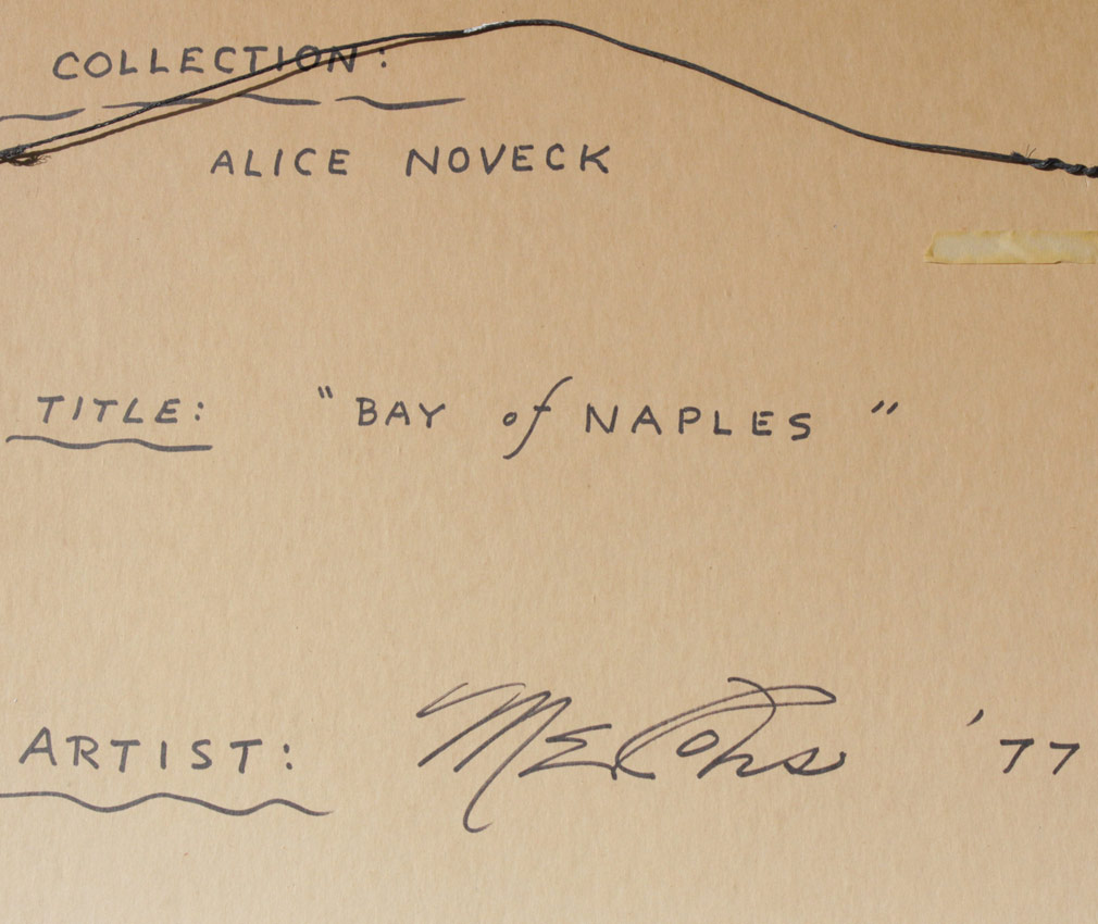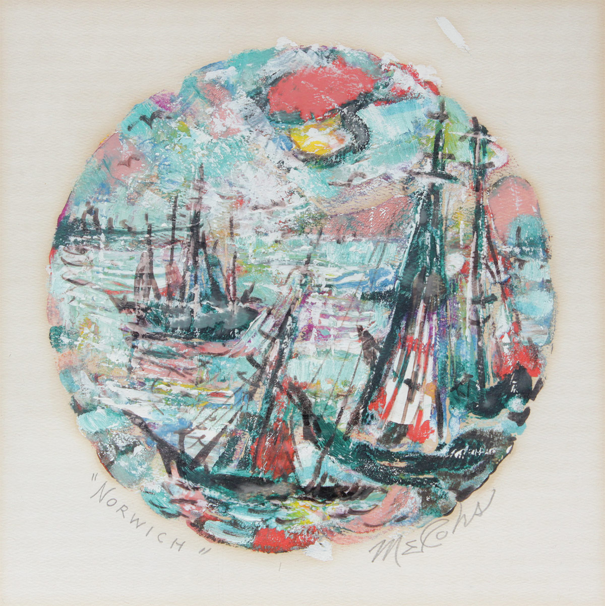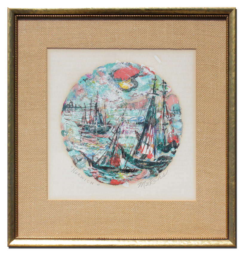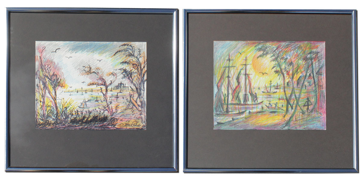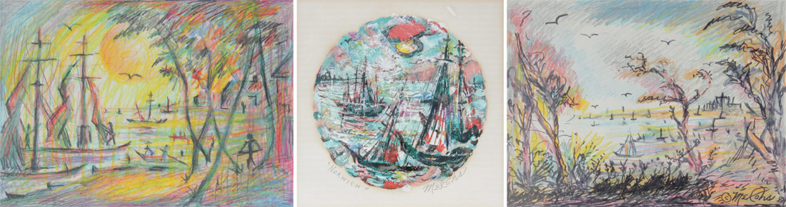 MELOHS, Charles, (American, 1908-1982): 1) Pastel, ''Bay of Naples'', Sight size 9'' x 12'', signed, dated '77, signed and titled verso ''From the Collection of Alice Novak''. 2) Felt Tip Marker/Pastel, Coastal Scene with Ships, ''A Signature into Art'', Sight size 9'' x 12'', signed lower right, dated verso, and titled 1976. Both encased in matching silver gilt frames 16 1/2'' x 18 3/4''. 3) ''Norwich'', Oil/Paper, Circular 9'' diameter, Sight size 11'' x 11'', pencil signed lower right, titled lower left, signed and titled verso, framed 17'' x 17 1/4''.
