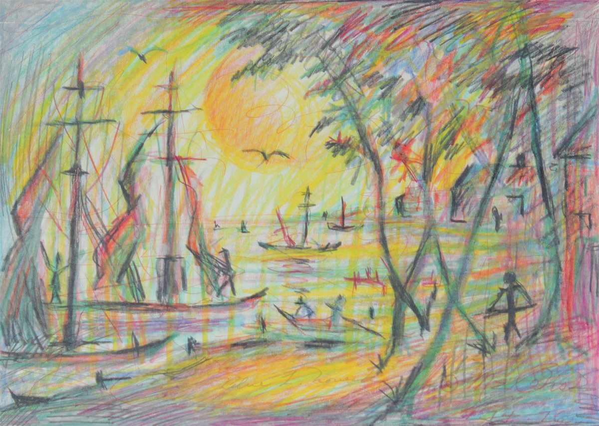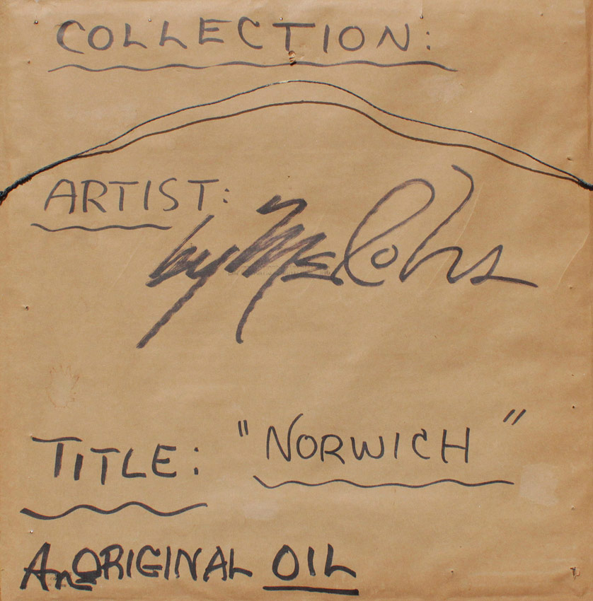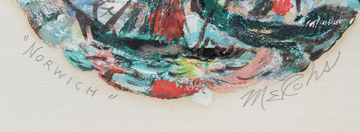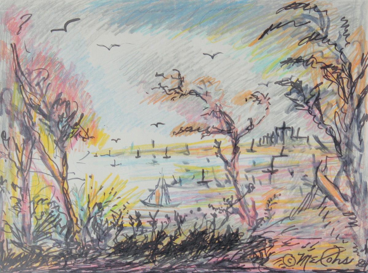 MELOHS, Charles, (American, 1908-1982): 1) Pastel, ''Bay of Naples'', Sight size 9'' x 12'', signed, dated '77, signed and titled verso ''From the Collection of Alice Novak''. 2) Felt Tip Marker/Pastel, Coastal Scene with Ships, ''A Signature into Art'', Sight size 9'' x 12'', signed lower right, dated verso, and titled 1976. Both encased in matching silver gilt frames 16 1/2'' x 18 3/4''. 3) ''Norwich'', Oil/Paper, Circular 9'' diameter, Sight size 11'' x 11'', pencil signed lower right, titled lower left, signed and titled verso, framed 17'' x 17 1/4''.