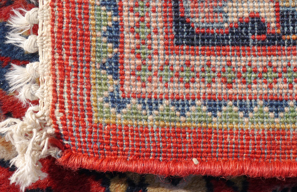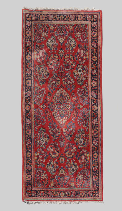 SEMI-ANTIQUE PERSIAN SAROUK HAND KNOTTED WOOL RUG, 3' 8'' x 7' 10'': This Sarouk rug has the dimensions of a rug well proportioned to go in many different room configurations. The red ground has a small central white bordered medallion and the rest of the field is covered with sprays of different flowers in colors of reds, blues, white, beige yellow and peach. The main borders deep blue background frames the field and completes the picture. Condition is good with some shading.