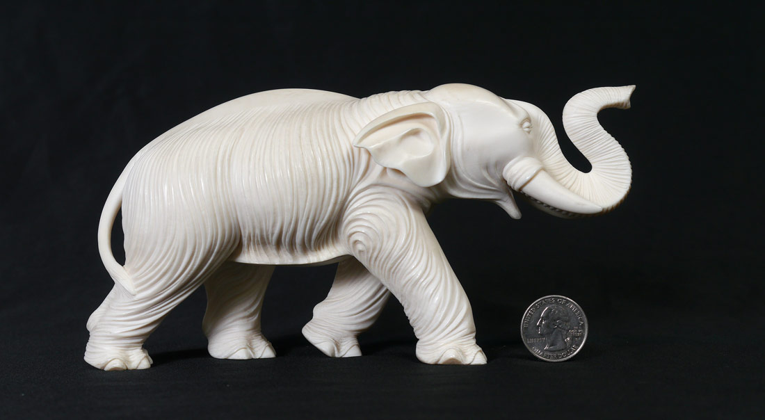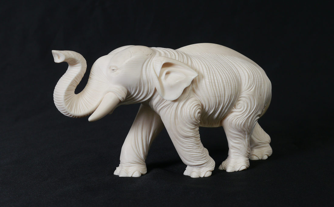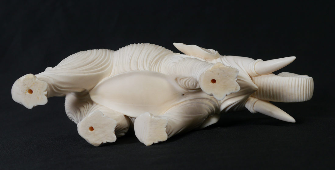 LARGE CARVED IVORY ELEPHANT: Elephant with deep carved skin lines. Unsigned. Overall 4'' h. x 8'' long.