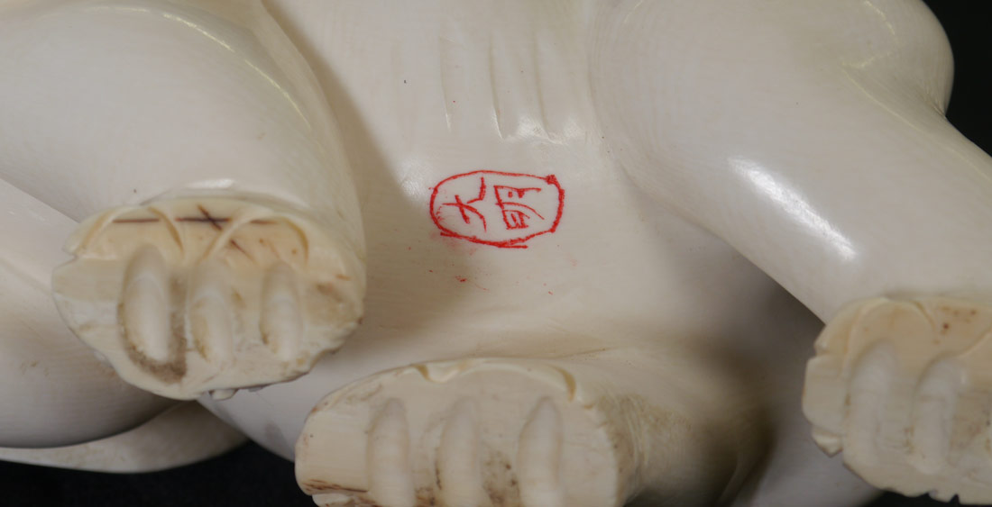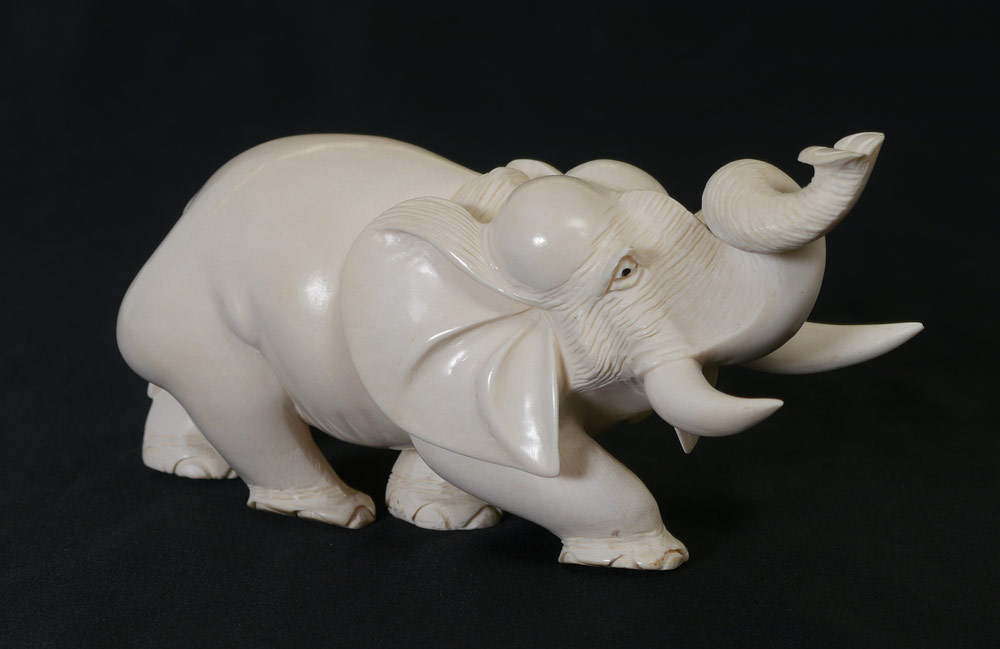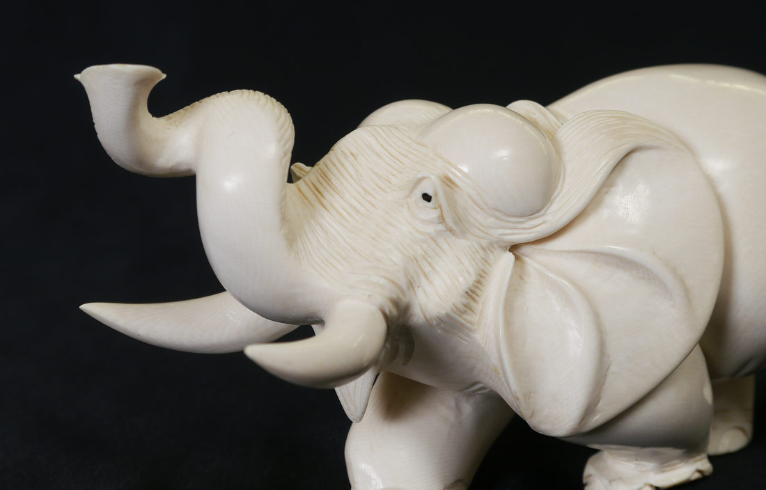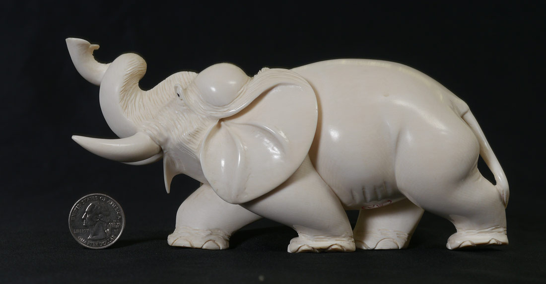 CARVED IVORY ELEPHANT: Signed, measures 3 1/2'' h. x 7 1/2''.