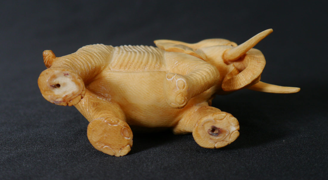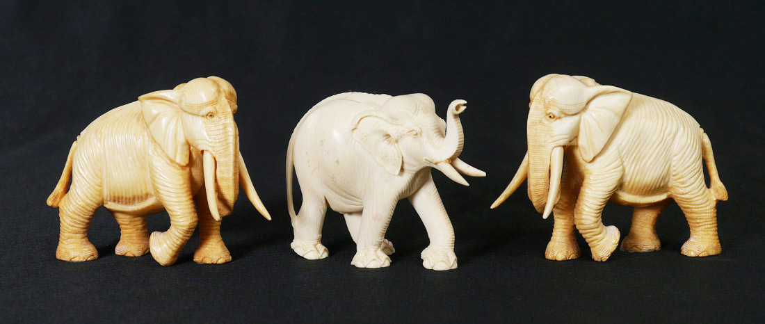 3 PIECE CARVED IVORY ELEPHANTS: 3 pieces total, each of similar size, all unsigned. Largest overall measures 3'' h. x 3 3/4''.