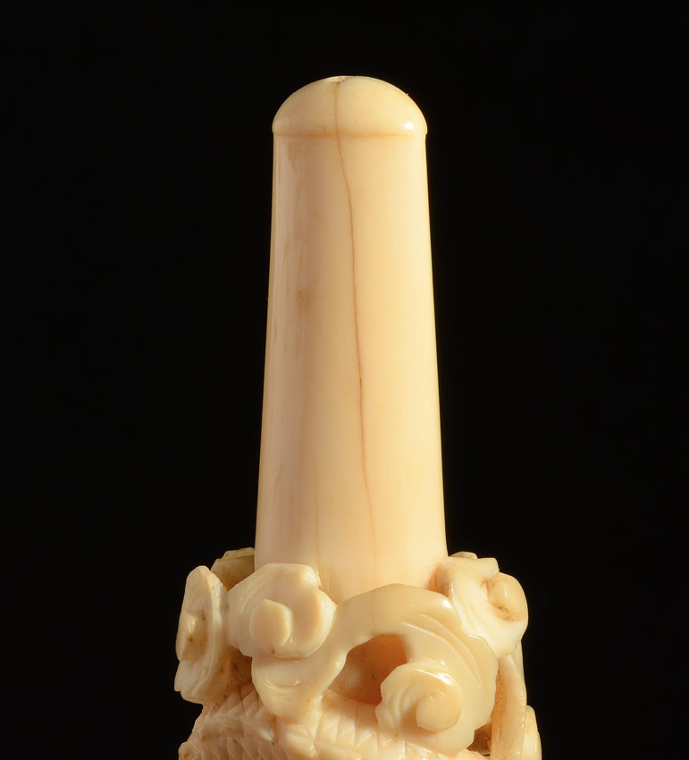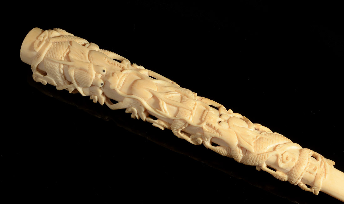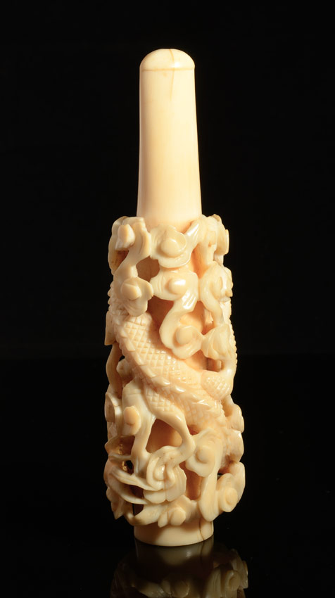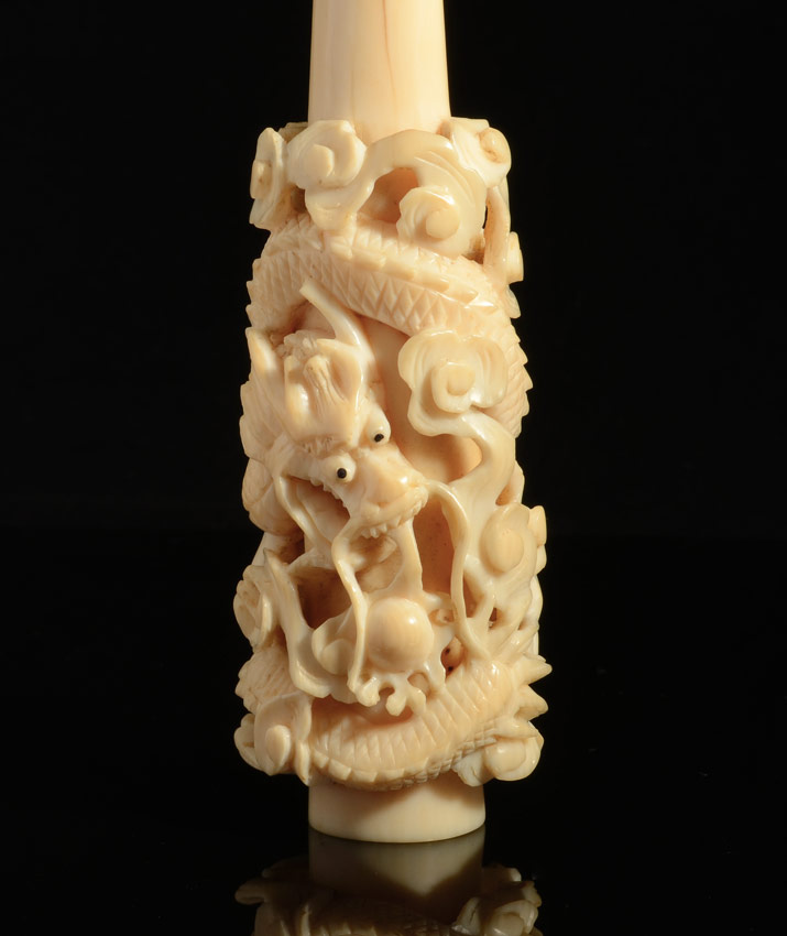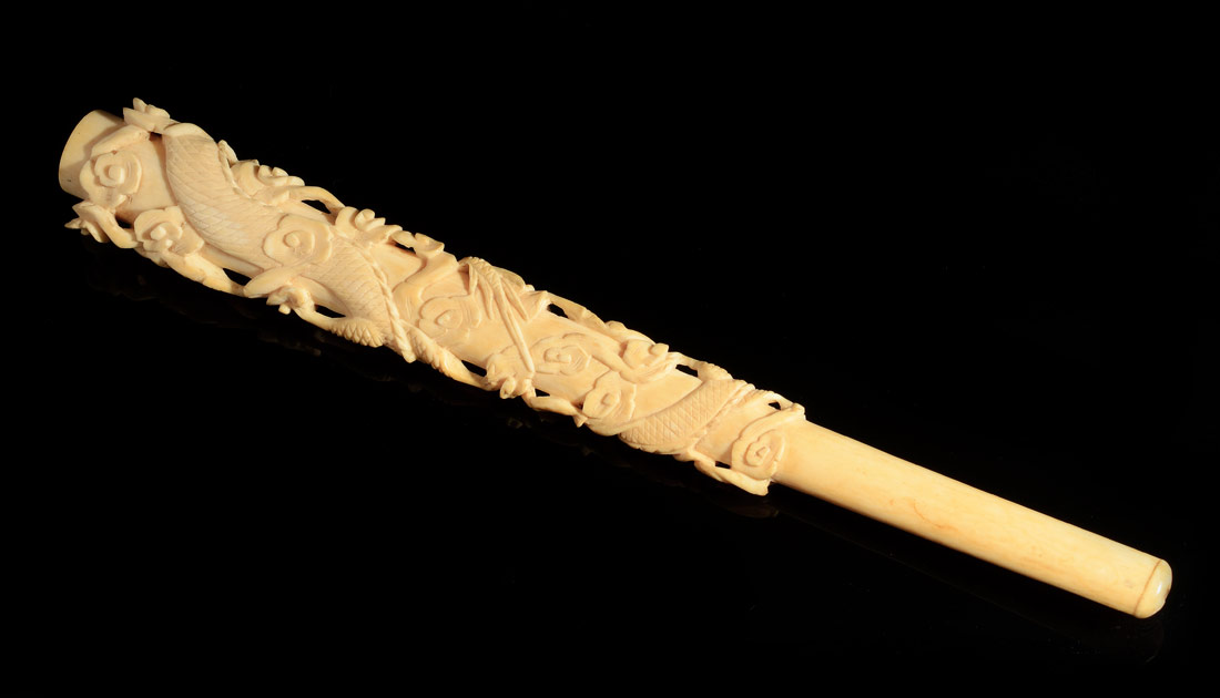 2 CARVED IVORY CIGARETTE HOLDERS: Each with carved dragon motifs, one measures 10 1/4'' l., the other 5 3/8''.