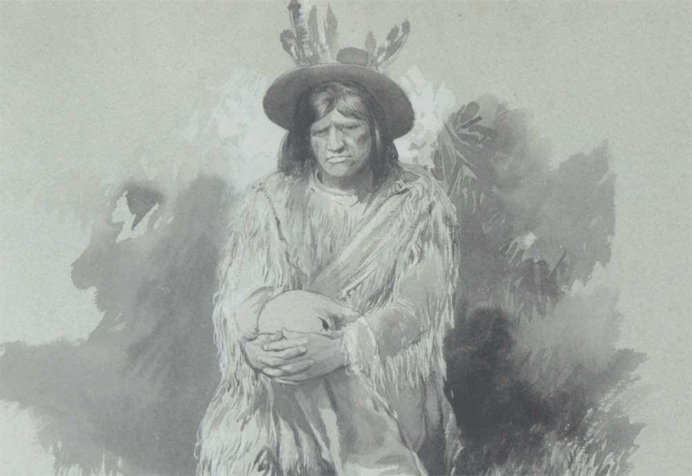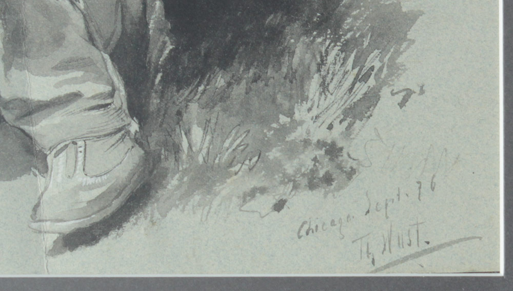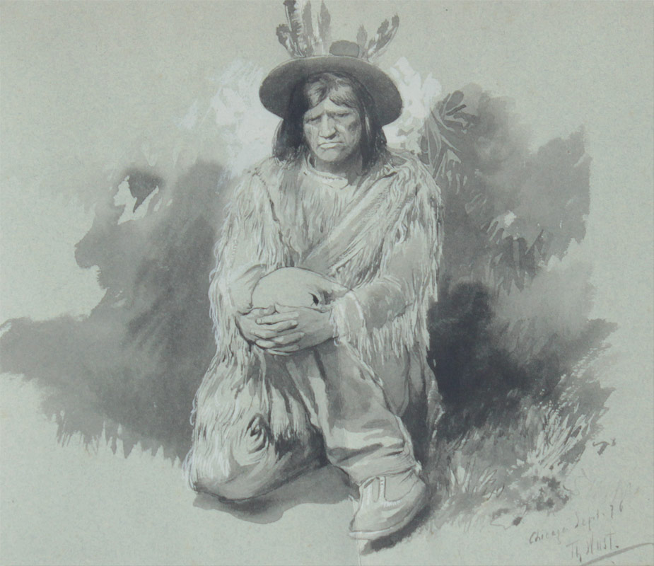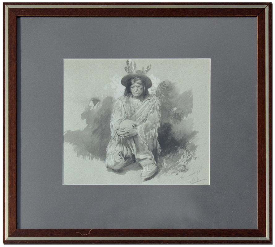 WUST, Theodore, (American, 1853-1915): Crouching Indian with Clasped Hands, Sepia/Gouache, Sight size 8 1/2'' x 9 3/4'', signed lower right, marked Chicago, September 16, contemporary frame 16 3/4'' x 18 1/4''.