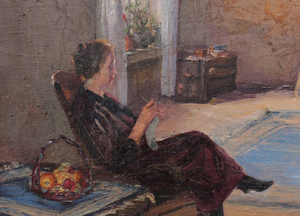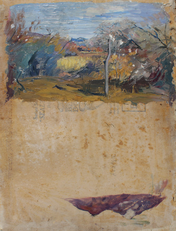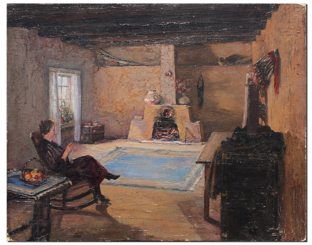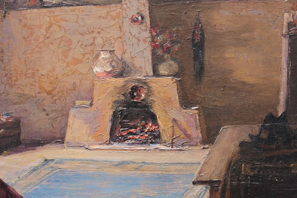 UNSIGNED SOUTHWESTERN ADOBE INTERIOR PAINTING: Oil/Canvasboard, Depicting a Woman Knitting by the Fireside Complete with Feathered Headdress Hanging on the Wall, Indian Pottery on the Mantle, 24'' x 30'', unframed, two sided painting with a partially finished sketch of a Valley Landscape, no visible signature.