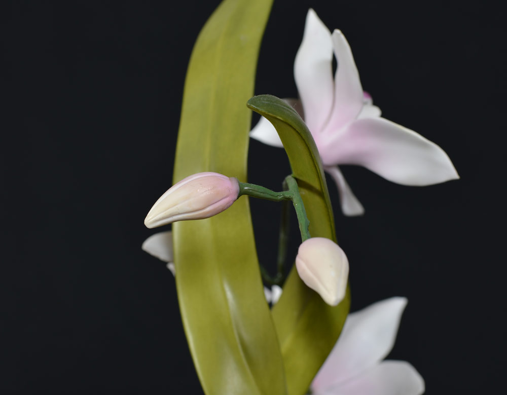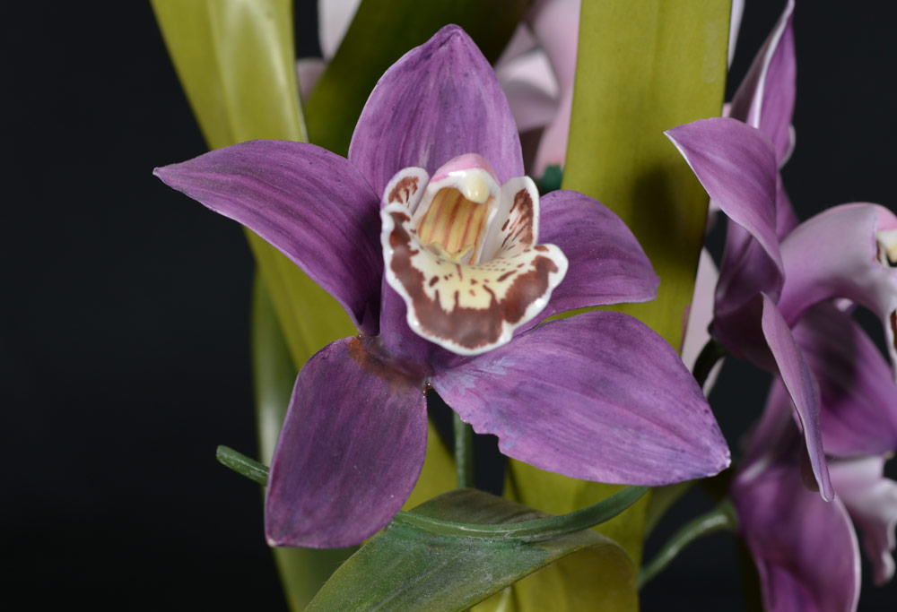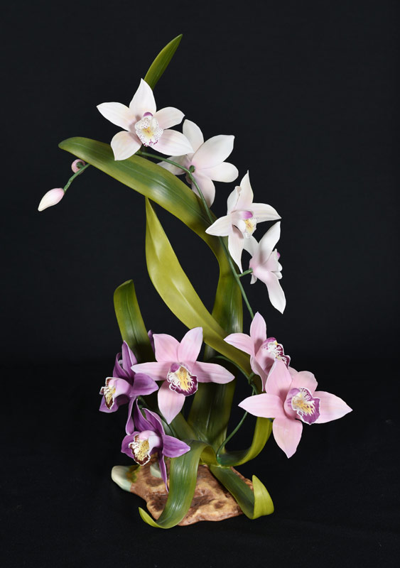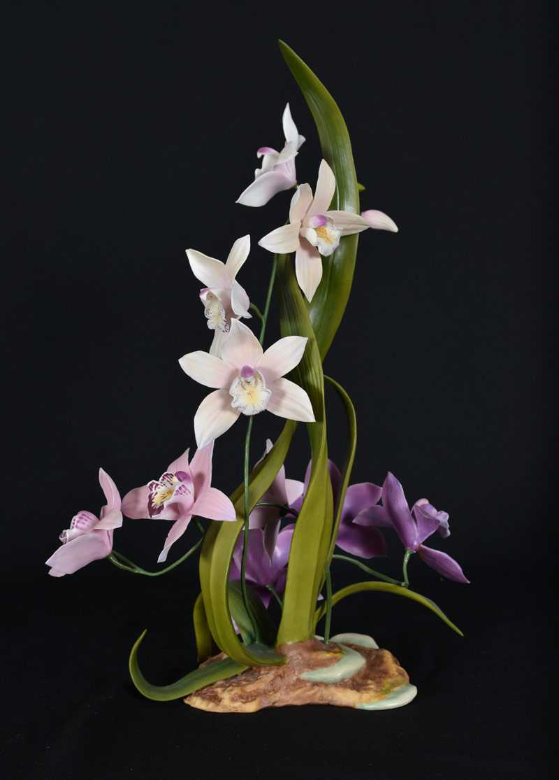 BOEHM PORCELAIN CYMBIDIUM ORCHID SCULPTURE: Figurine of a Cymbidium Orchid, #30155, number 235, limited edition, dated 1984. 19 3/4'' h. x 14''.