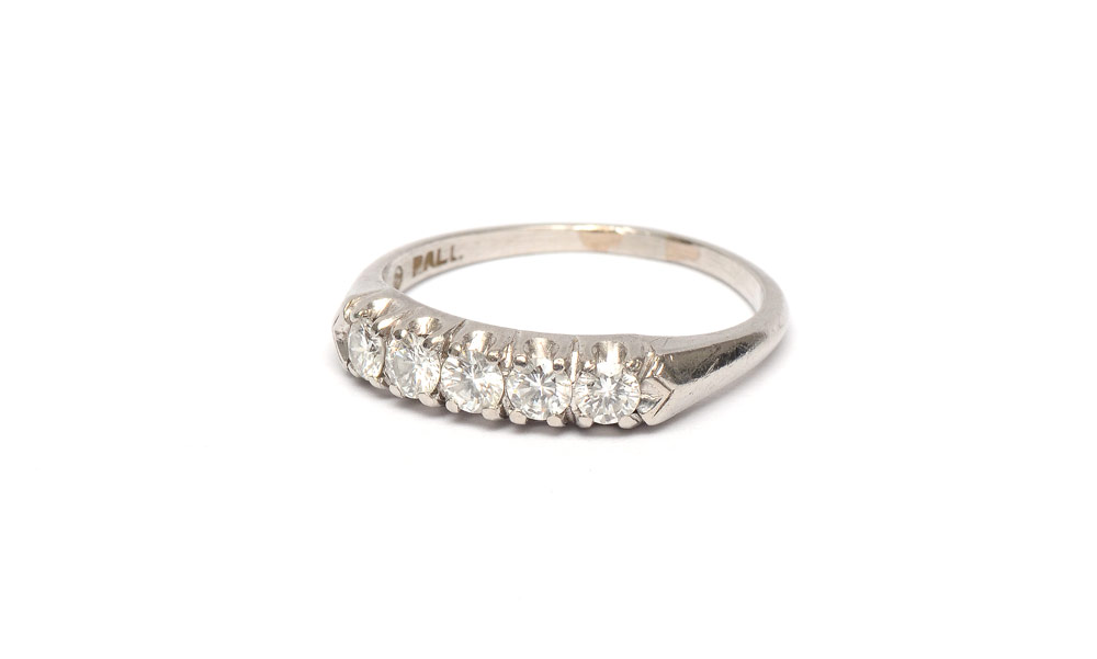 PALLADIUM .50 CTW DIAMOND BAND: Palladium band contains 5 round brilliant cut diamonds totaling approx. .50 Ct.. The diamonds average VS in clarity and G-H in color. The diamonds are prong set. Weight: 2.7 grams. Size: 7.25.