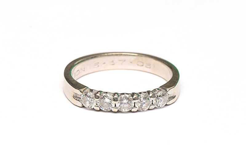 DIAMOND WEDDING OR ANNIVERSARY RING: 14K white gold band contains 5 round brilliant cut diamonds totaling approx. .50 Ct. One diamond is chipped. The diamonds average VS in clarity and G-H in color. The diamonds are prong set. Weight: 2.9 grams. Size: 5.5.