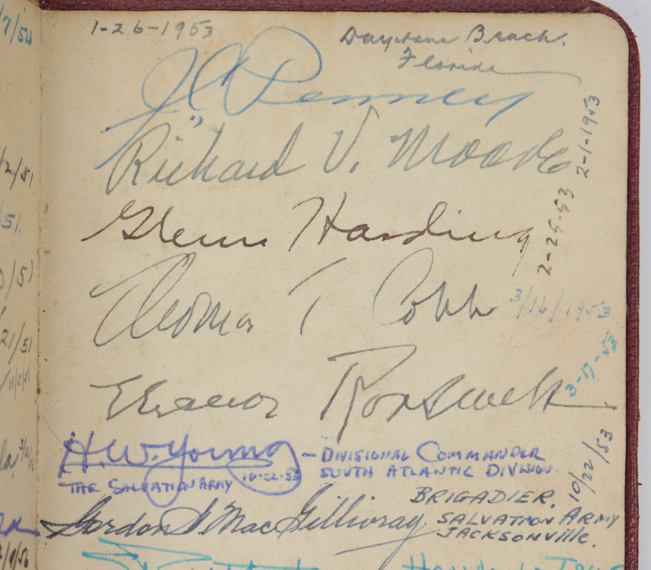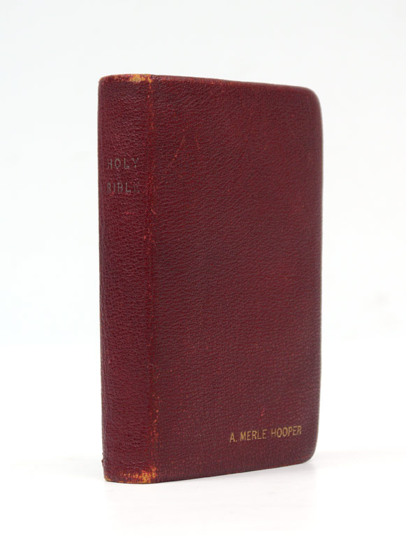 20TH CENTURY AUTOGRAPHED BIBLE: A unique and varied collection of autographs in a single small bible dating from the 1910-1950's. Autographs to include Eleanor Roosevelt, JC Penney, Chief White Eagle, Chinese diplomats, WWII era officers, other political and secular autographs. Measures 5 1/2'' x 3 3/4''.