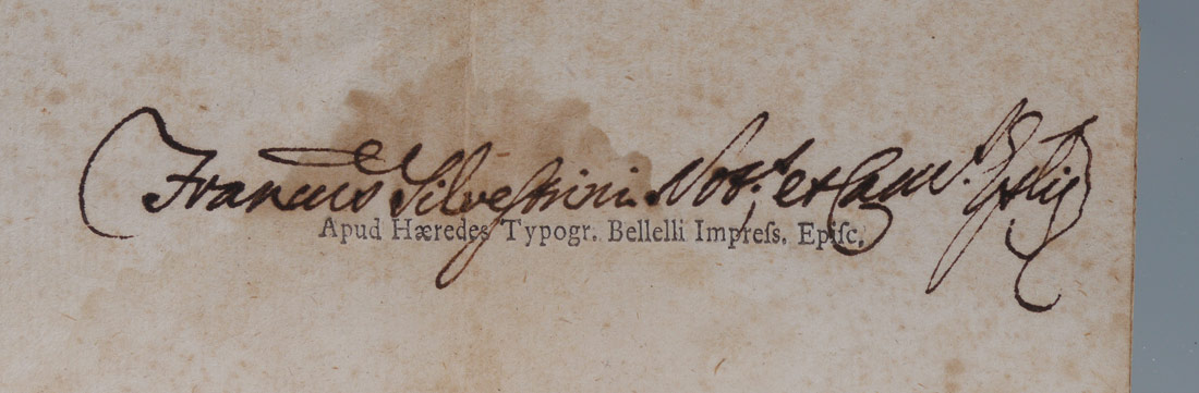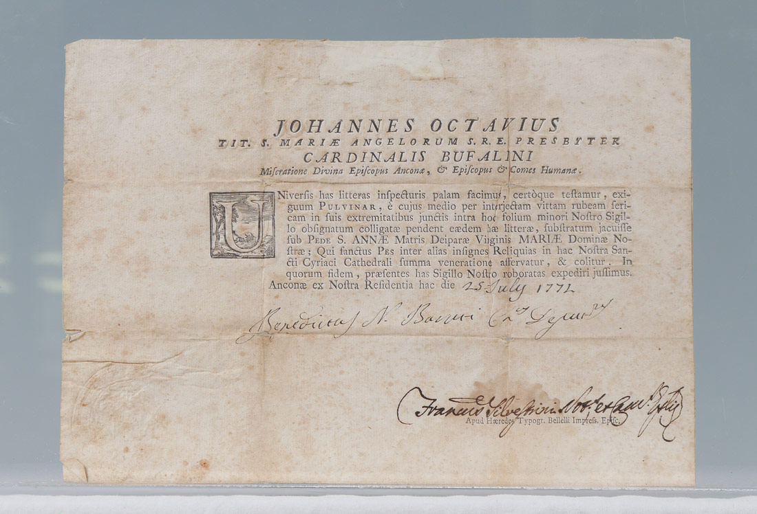1772 SIGNED PAPAL DOCUMENT: A printed document in Latin of the Archbishop of Acona e Numana, Italy, Cardinal Bufalini, dated July 25, 1772. Bearing 2 signatures, blind stamp. Measures 7 1/2'' x 10 1/4''.