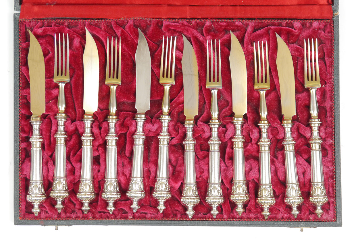 GERMAN FINE SILVER FRUIT SET IN PRESENTATION BOX: 12 piece knives and forks with German 800 silver hollow handles. Knives 7 5/8'' long. In presentation box with dealers name ''Gehr. Friedlander, Hop-Juwelier, Berlin'', 1 x 13 1/2'' x 9''.