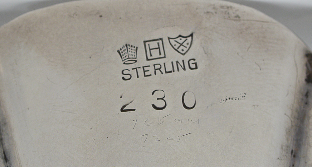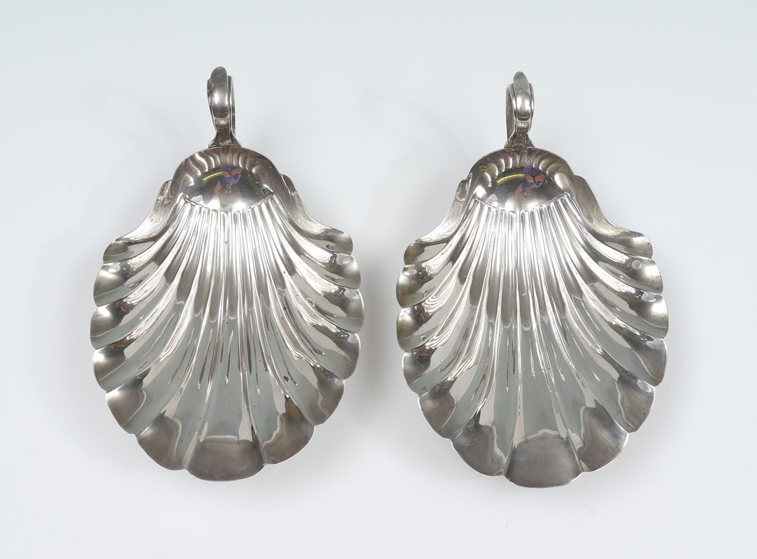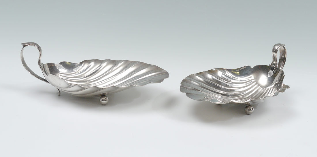 PAIR HIRSH SHELL STERLING SILVER SERVING DISHES: Handled and footed shell form serving dishes by M. Fred Hirsh Co. Each measures 3'' h. x 8 1/4'' x 5 1/4''. Approx. 13.3 troy oz.