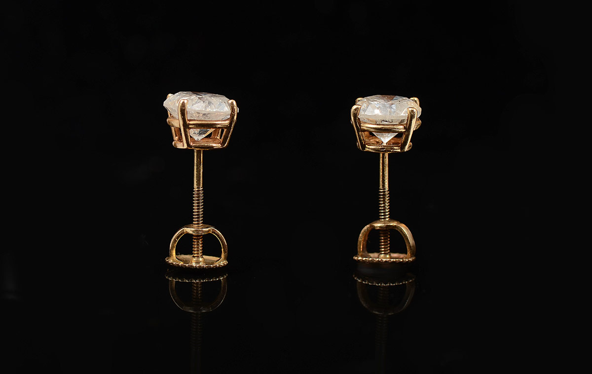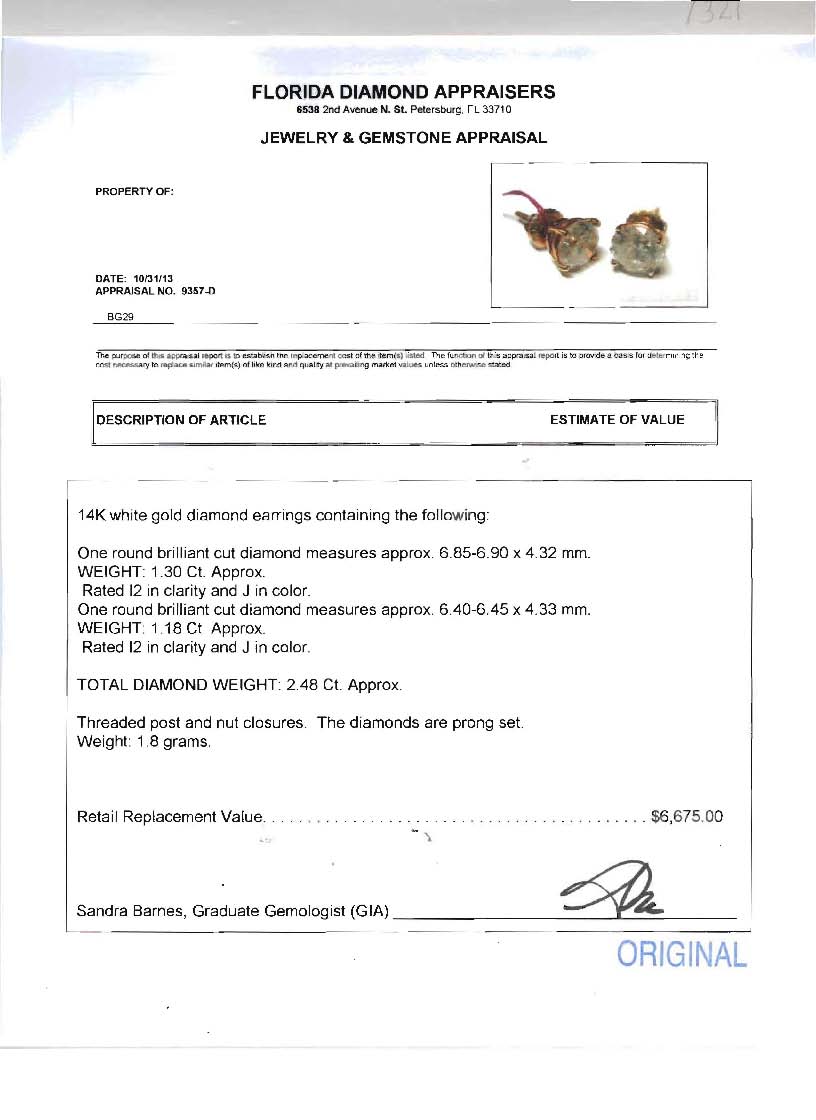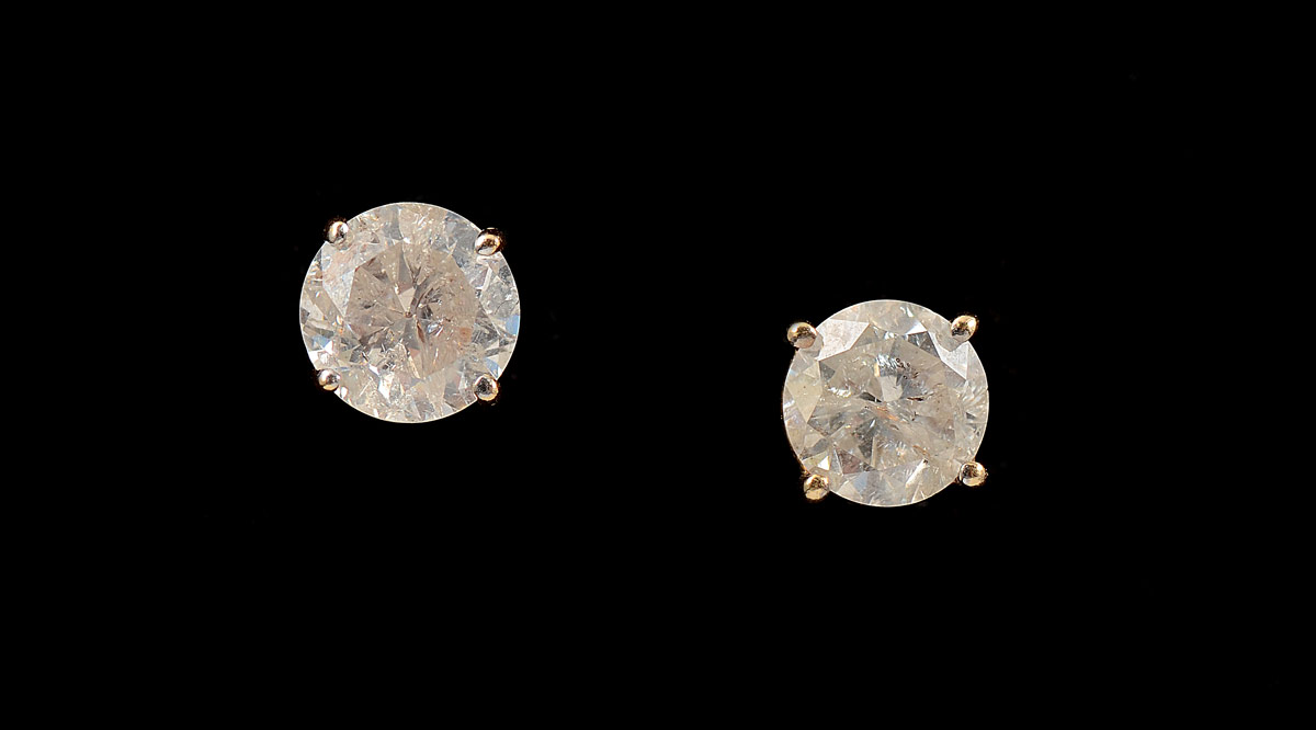 2.48 CT DIAMOND STUD EARRINGS: Two round brilliant diamonds in 14k yellow gold. The diamonds are rated I2 in clarity and J color. Threaded post and nut closure. Prong set. Weight 1.8 grams. Sold with current Florida Diamond Appraisers GIA graduates appraisal for $6,675.