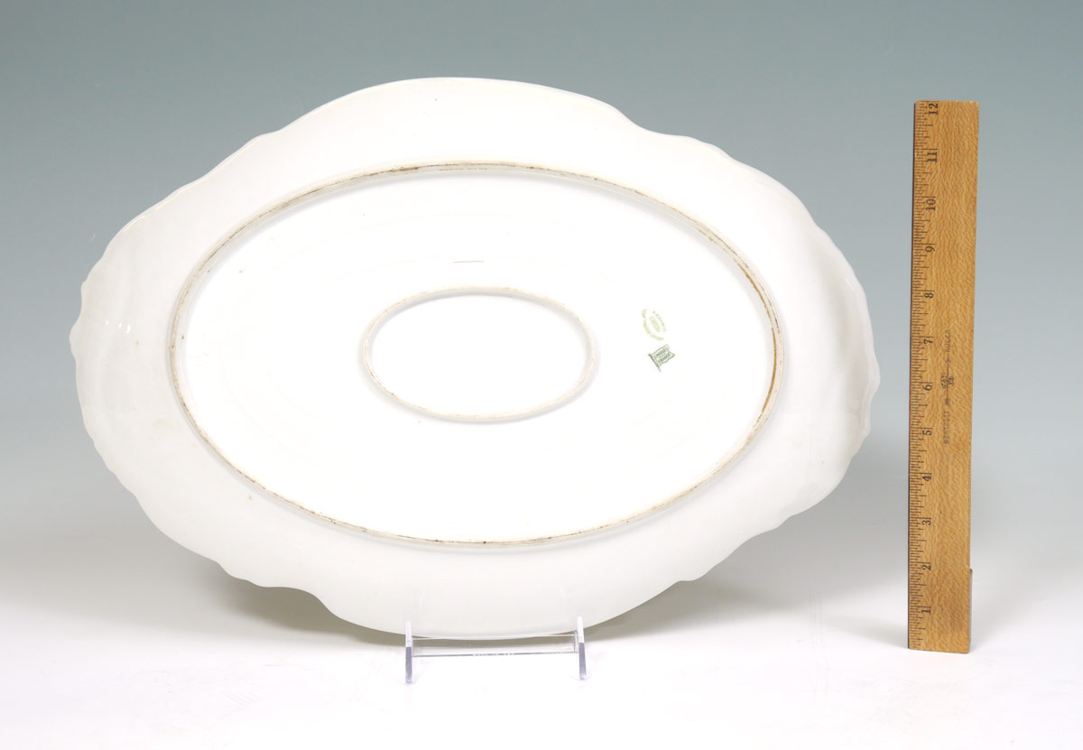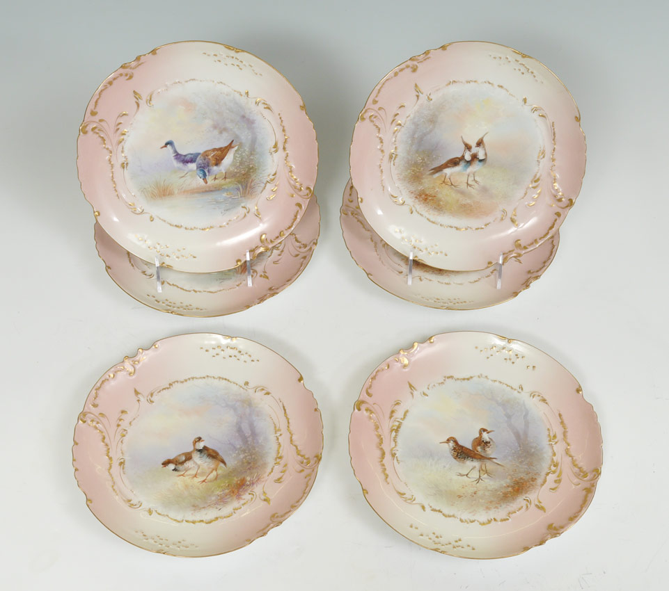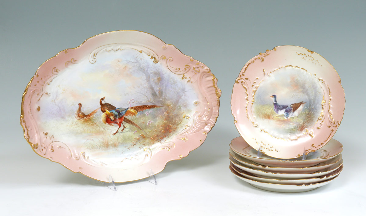 LIMOGES GAME PLATTER & PLATES: 7 piece set by Barny, Rigoni, Langle to include platter with pheasants (18 1/4'' x 12 1/2''), 6 plates with assorted birds (9 1/2'').