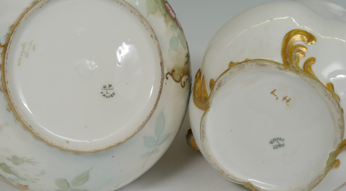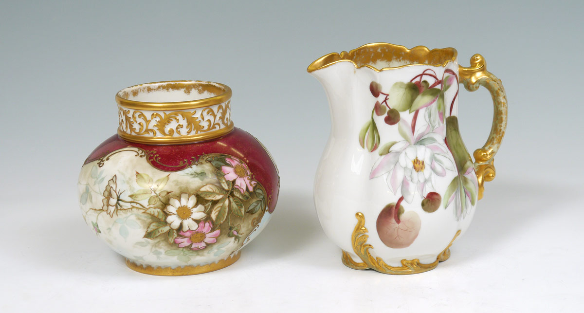 FRENCH LIMOGES JARDINIERE AND PITCHER: 2 pieces total to include 1) 1891-1932 Jean Pouyat hand painted floral motif jardiniere with gilt decoration. Signed on base WM Lycett, Atlanta Ga.. 7'' h. x 7 1/4''. 2) Haviland hand painted floral motif pitcher. 8 3/8 ''h. x 8 1/2''.