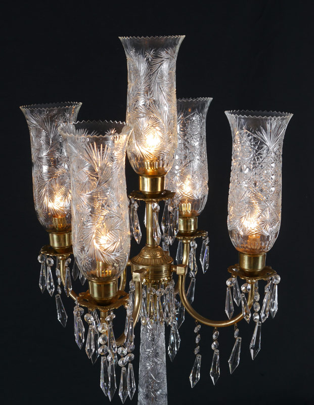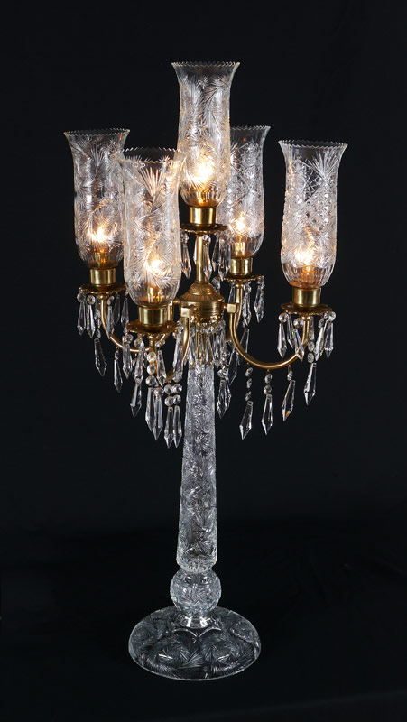 5 LIGHT CUT GLASS TABLE LAMP: Cut glass base and body, 4 brass arms and central light, crystal prisms. Cut glass hurricane style shades. Overall 42 1/4'' h. x 18 1/2'' dia.